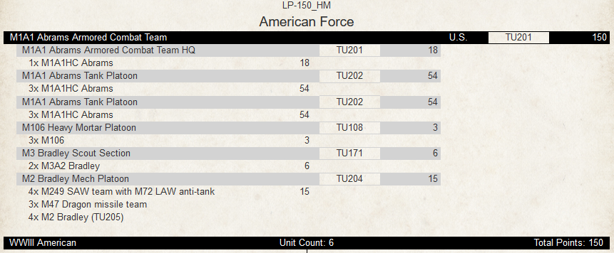 Two platoons of “HC” standard M1A1s plus a similar HQ is a lot of heavy metal, by tonne at least! We easily meet our 112pt minimum spend on “Heavy Metal” units.