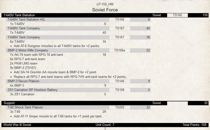 I opted for mass, “Heavy Metal” style, with the T-64BV. Sporting “Advanced Stabilisers” it can put the “pedal to the metal” to try and flank the depleted uranium enhanced front armour of the M1A1HC whilst doing their best to survive the incoming TOW2 and DU fin rounds through their Kontakt-1 ERA armour and numbers. A Shock platoon of T-80 provides a hardy reserve, both through its enhanced Kontakt-5 ERA armour and being hit on 4s.