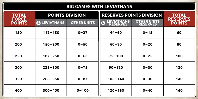 As alluded to a paragraph ago, we lift the army selection rules for “Big games with Leviathans” from the PDF, albeit changing “Leviathan Units” to “Heavy Metal” units. So, we need to spend 75% of our points on “Heavy Metal” Units, minefields are reduced in frequency and reserves must be a mix of “Heavy Metal” and non “Heavy Metal” units. I’ve included the table from the PDF to guide points.