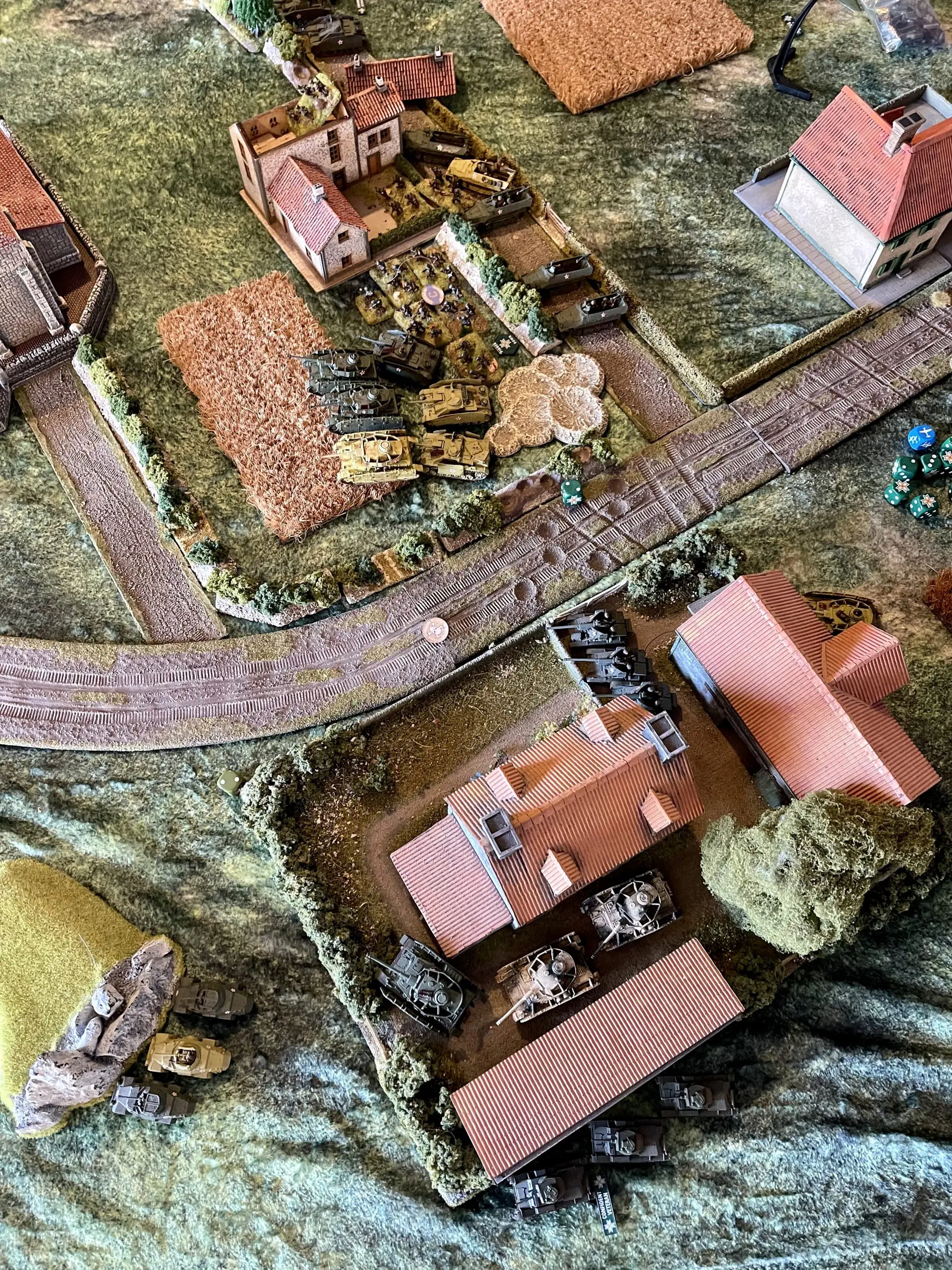 Mark or course got reserves with his first roll, but they did appear in the wrong place so he burned his lucky card for a re-roll…..and yup re-rolled a 1 so his Churchills (a good support choice for infantry recce) appeared on my right). Being honest, the double rolled 1 was about the high point of the game from a Romanian perspective. My Stuka decided to switch targets to the large congregation of armoured cars and carriers milling about near the objective, effectively preventing an infantry assault from out of the church, ranged in first time, hit two carriers, two armoured cars and a 17pdr, killed… a 17pdr 🙁