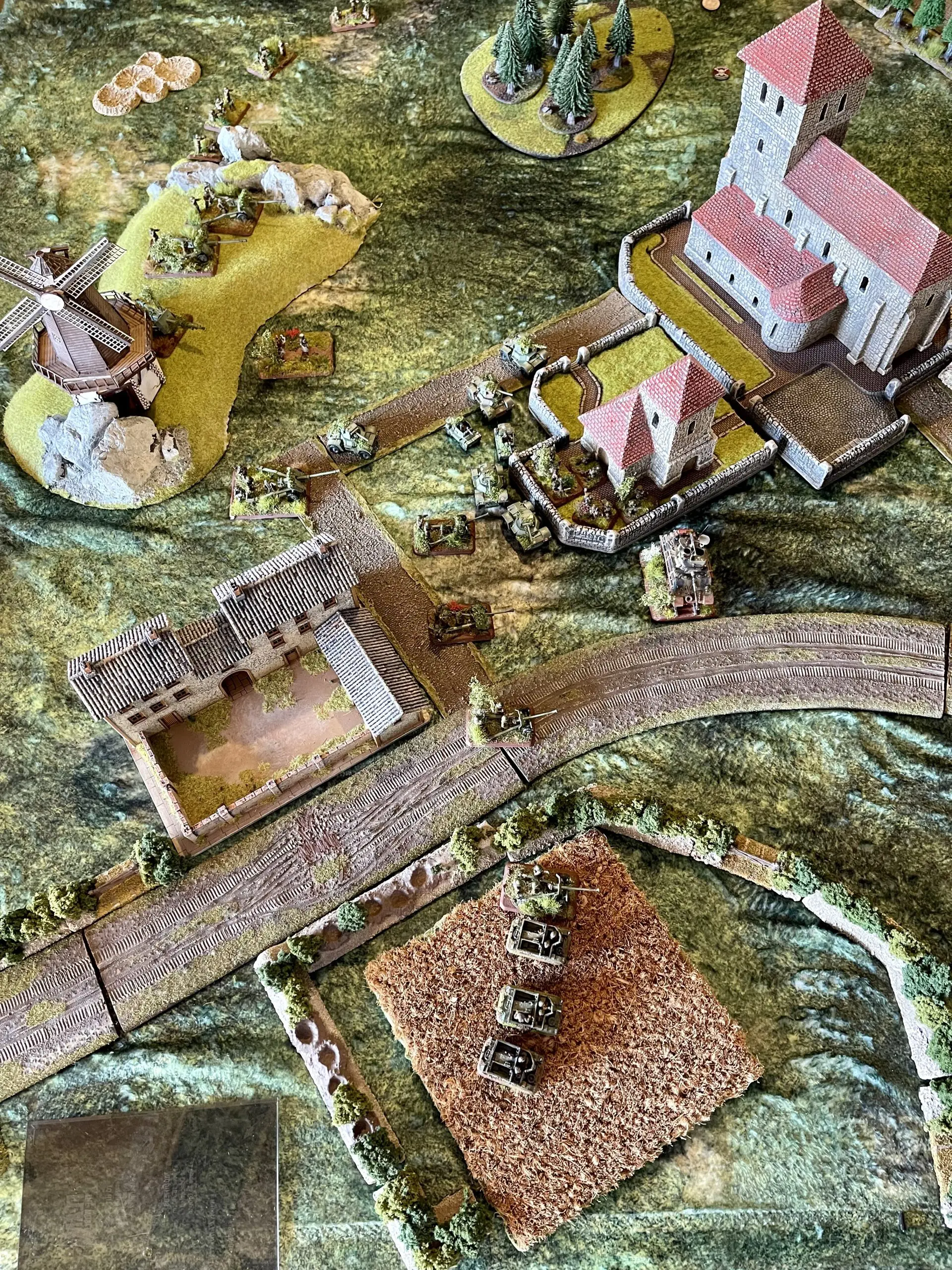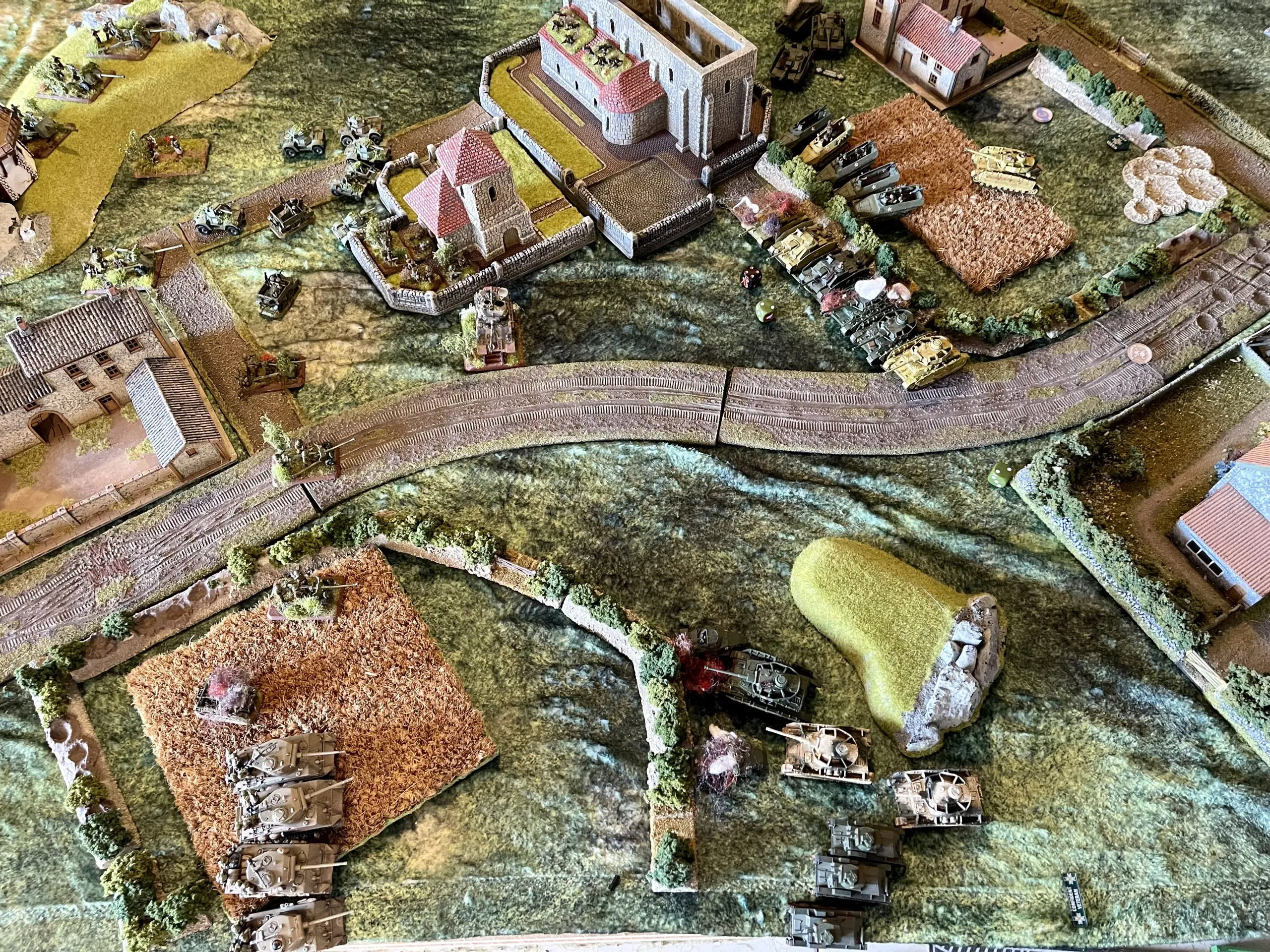 Mark, of course, unpinned his 17pdrs and remounted the Carriers so, at least for the time being, I tried to be reasonably cautious and try and avoid giving the big AT guns too many targets. The infantry occupied the church and I pushed forward on the left.