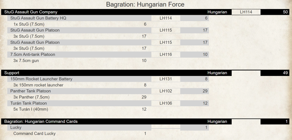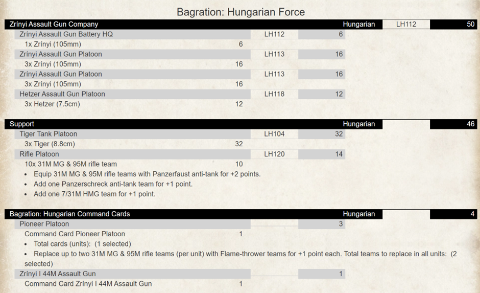 The other really useful Hungarian platoon in an attack are the Hungarian Pioneers which are another unit I have from the MW project build. These aren’t a LW option as such but can be built by upgrading a Rifle platoon with the Pioneer Command Card, now equipped with Panzerfausts, and with the addition of a Panzershrek team as well as 2 Flame Thrower teams these are a really flexible and big unit to have on the table top, I can even add a 7/31M HMG team for some extra defensive firepower – in all I can get a total of 12 teams into my platoon for 17 points giving them plenty of staying power to assault with. This brings me neatly to my target 100 point total. Alternatively I could reuse the 150mm rockets from my StuG Force and have fewer Riflemen (that would provide a helpful smoke bombardment).