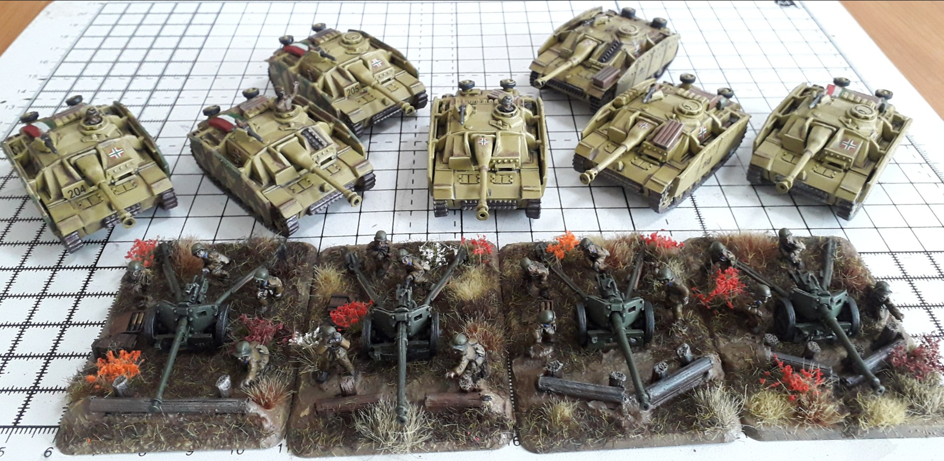 I’ll start with the StuG Formation, it offers the least variation just consisting of the single vehicle type but does have the option to add a PaK40 anti-tank gun platoon in place of the final tank platoon reflecting the lack of vehicles Hungary had to fill out these regiments. As I already had such a gun platoon painted up that would speed things up, I only need to paint 7 plain coloured tanks to get it onto the table. I formed a Formation comprising an HQ tank, 2 platoons of 3 StuG’s and a 3 gun 75mm anti-tank gun platoon which comes in at exactly 50 points, half a standard gaming army. Overall it’s a small Formation with a lot of medium anti-tank capability. Its not going to assault much with small platoons and the assault gun assault penalties, it has reasonably good armour of FA7 combined with its Fearless Motivation and Cautious rating (is hit on 4+) making it ideal for playing a defensive battle.