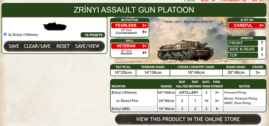 The Zyrini is an interesting tank overall being relatively cheap compared to other similar tanks (notably the German Stuh) and benefits enormously from uniquely having a ROF2 gun that can effectively bombard, AT 10 isn’t great but having HEAT ammunition means it is just as effective as an AT11 tank at long range and Brutal is useful, costing the same as a StuG, overall for the loss of 1 point of Side & Rear armour and 8” (20cm) of range you gain an AT3 FP3+ bombardment capability which I recon is a decent trade off and certainly makes the Zyrini a more than useful tank than the StuG in my other build. The only real down side is you can never have more than 3 tanks in a platoon, so the Formation again lacks mass.