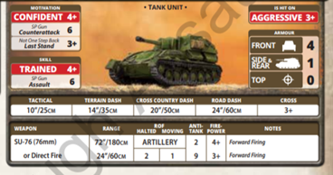 This is, (unsurprisingly,) the lightest of all the assault gun options. Being hit on a 3+ and having low armour means they need to be wary of anything bigger than an armoured car. In terms of offensive power, they have a respectable bombardment that has a chance of digging out some infantry. Direct fire is AT 9 with two shots if they stay still. Whilst this won’t worry any Panthers or Tigers, it is high enough to at least give Panzer IVs cause for concern, especially if you take the SU-76 in volume.  Volume is certainly something that’s easy to achieve;-four full units of SU-76 and their T-70 HQ will only set you back 53 points, leaving plenty of points left over for some harder hitting support options.