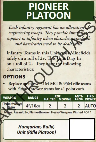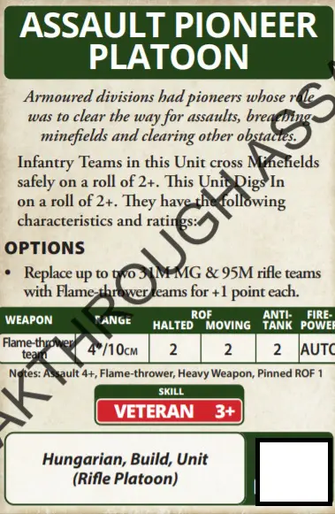 While the Pioneer rules are pretty standard across all forces the ability to take a Flamethrower is rather tasty. Mixed in with a platoon of ten stands of confident/cautious infantry with a ‘faust plus a panzerskrek and you have a very capable unit.