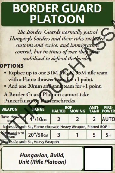 The Border Guard platoon is pretty interesting. You can put them into your normal Rifle Company, where they provide the Flamethrower option of the pioneers, but without the associated cost of the card plus the option for a 20mm AT team. Losing the Panzerfaust is a big loss but I think swapping one platoon out may be an option. It will also be useful as formation support to a tank company which already has lots of AT.
