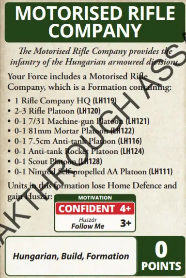 Compared to the Rifle Company you lose the 3+ last stand and gain a 3+ follow me. This makes them a little more aggressive and able to move up the table quickly. The make up of the formation also changes slightly. The 40mm gun option is gone along with the 120mm mortars and Huszar troop. Instead you gain a Nimrod AA option.
