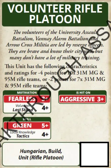 Considering this is a minor nation (and there are two other nations in the card pack) that’s quite a lot of stuff. It provides some new options and expands out the infantry choices. The volunteer rifles are very cheap and certainly has my interest. I think Hungarians are going to be a solid reliable addition to the tabletop.