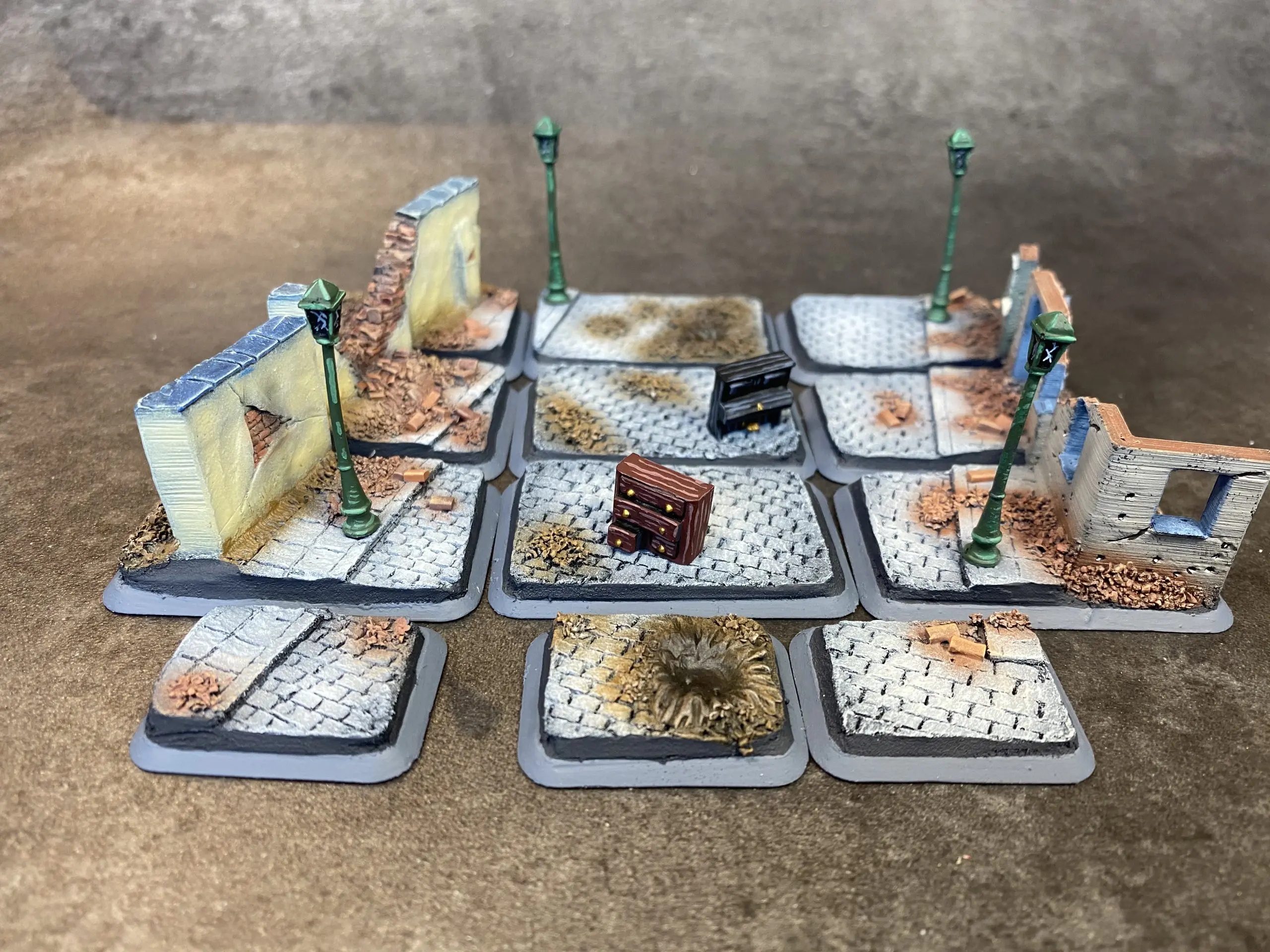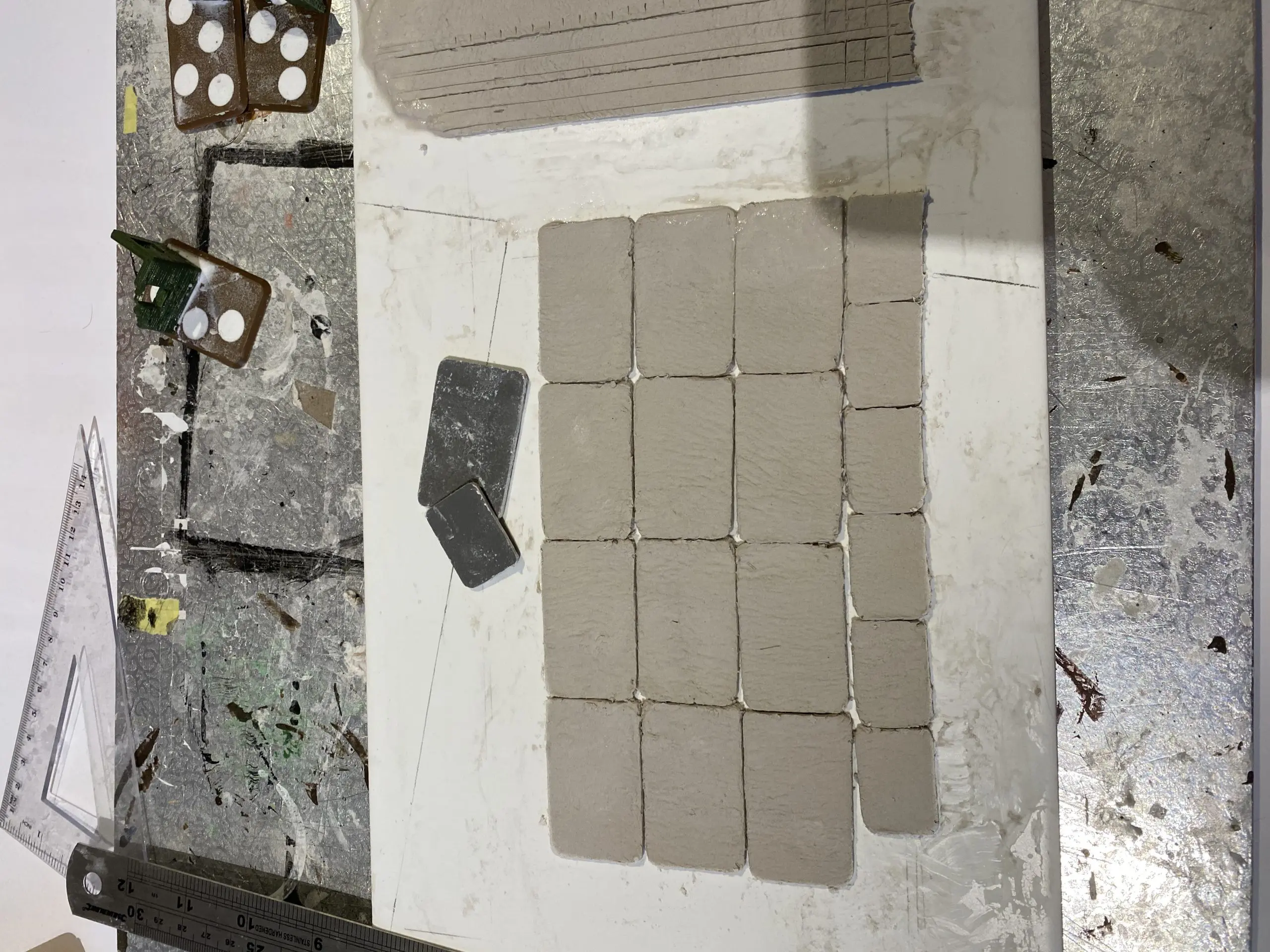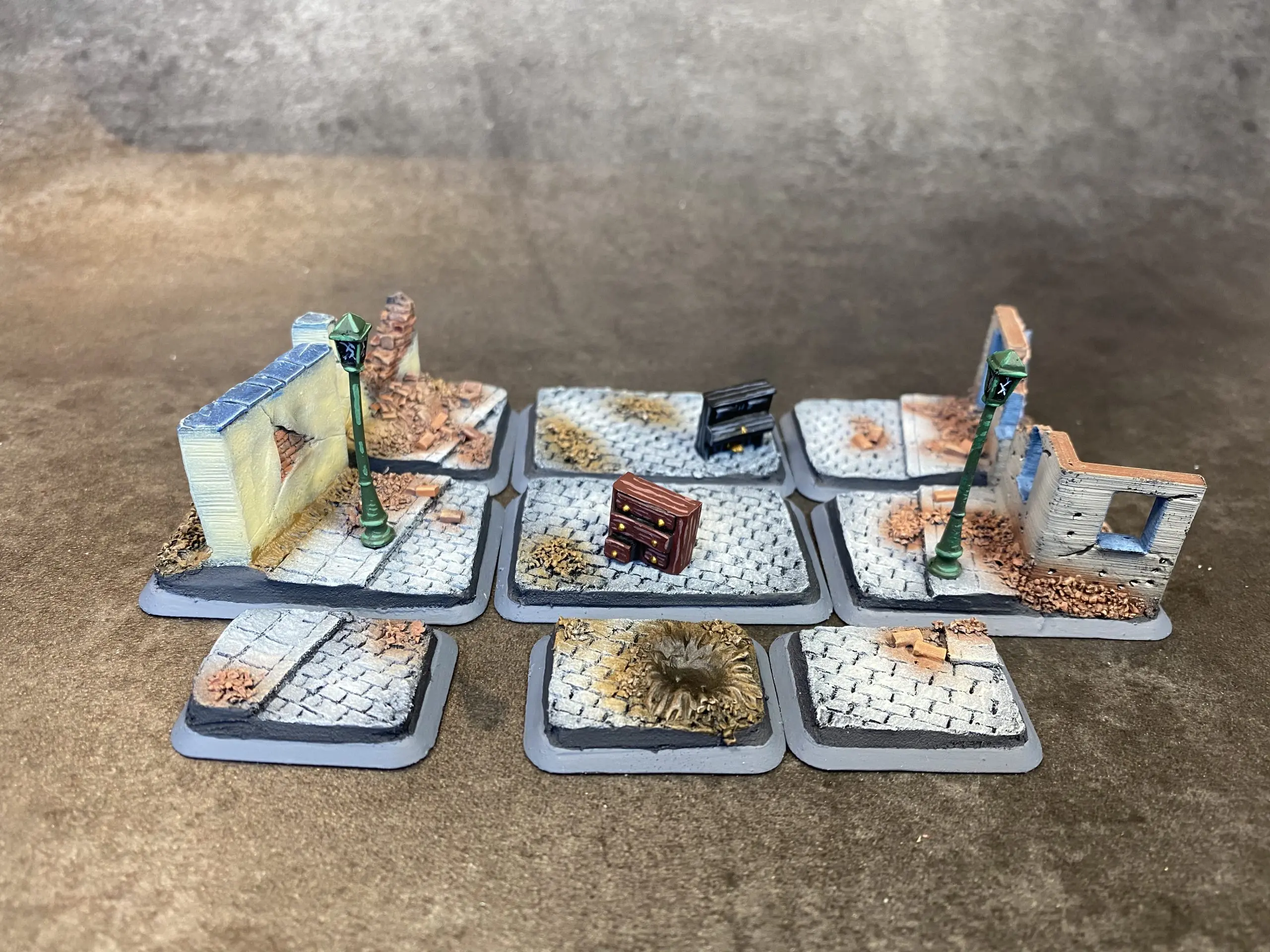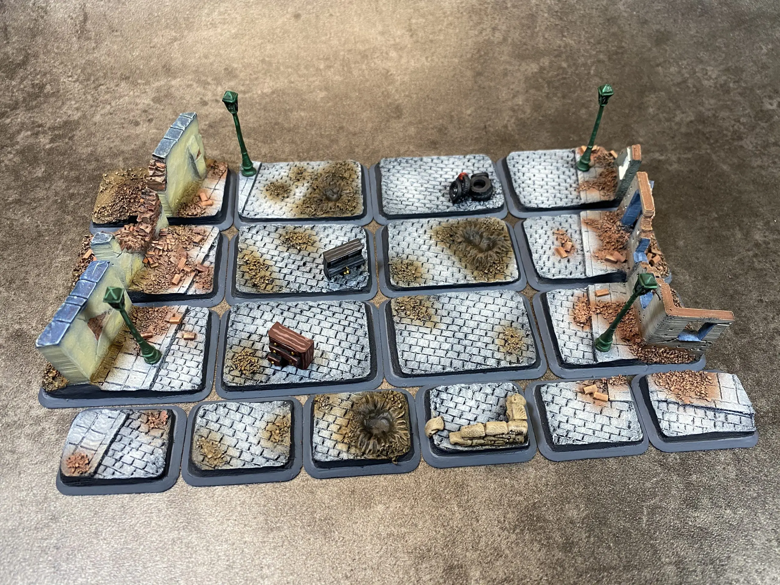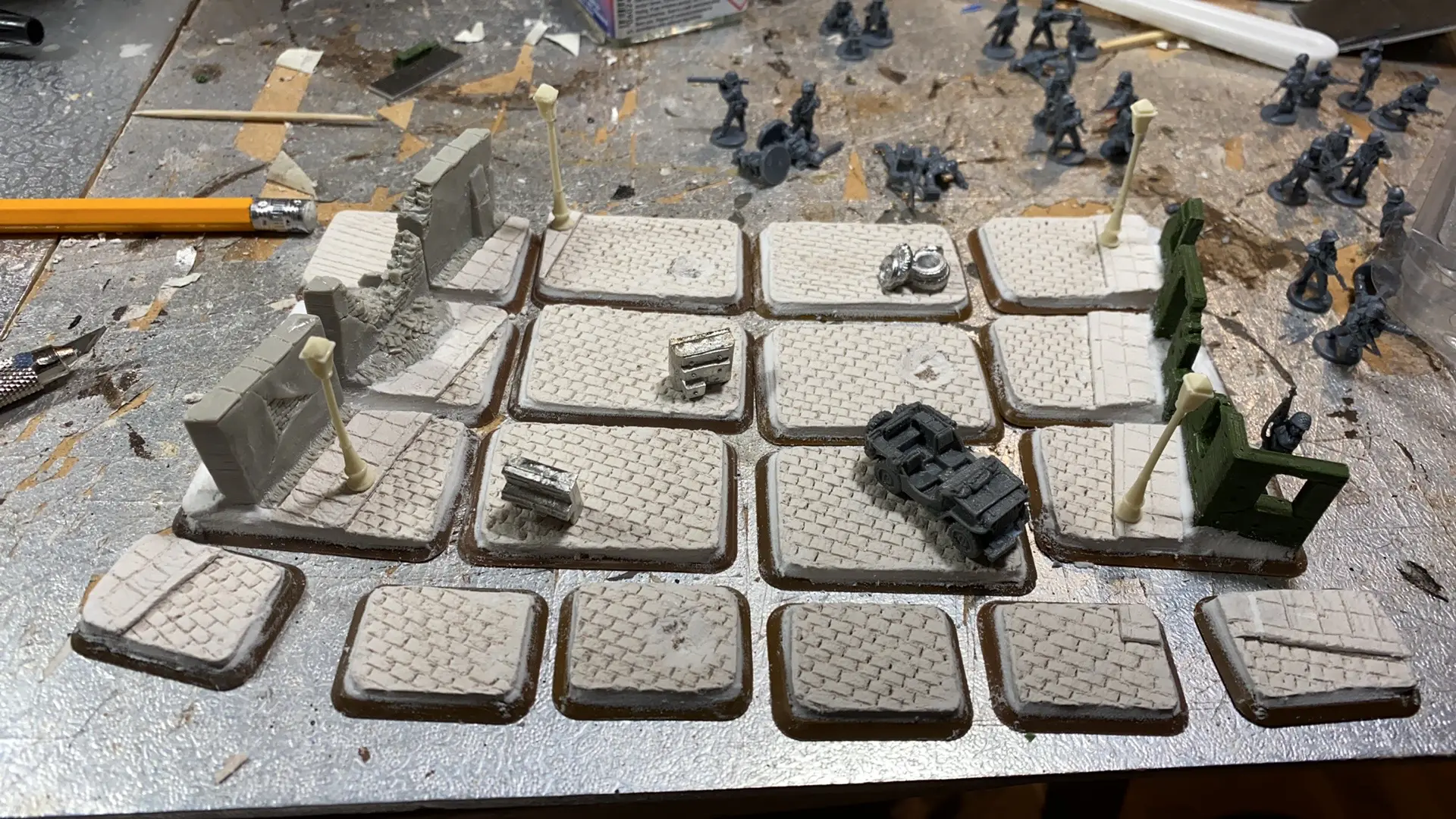 For the cobblestone street and sidewalks I used DAS air drying clay mixed with a little bit of white glue to ensure it would stick together. To get the right sizes for the bases I made 2 templates out of some vinyl so I could cut the clay while it was still wet making it a lot easier. If I had just used the bases themselves the clay would have been a little too big because the Battlefront bases has bevelled edges. I used an old tile as work surface to be sure the clay wouldn’t stick.