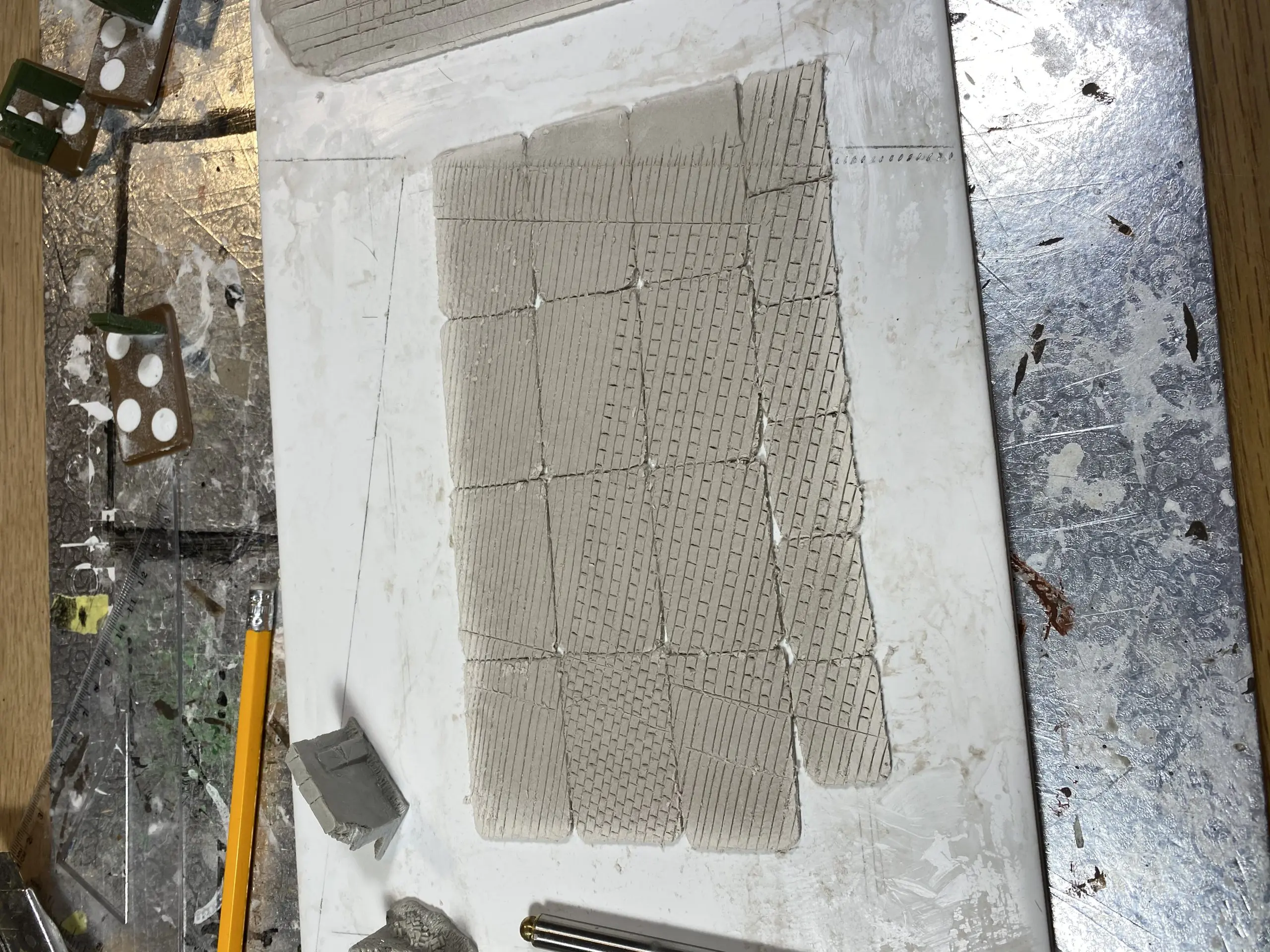 After the clay had dried for an hour, I stated cutting the patten of the cobblestones and the tiles in the sidewalks. As you can see I didn’t cut the line perpendicular to the edges in an attempt to make the hole scene look more dynamic, this was a trick from Rubén. In the photo you can also see the sidewalks furthest to the top right.