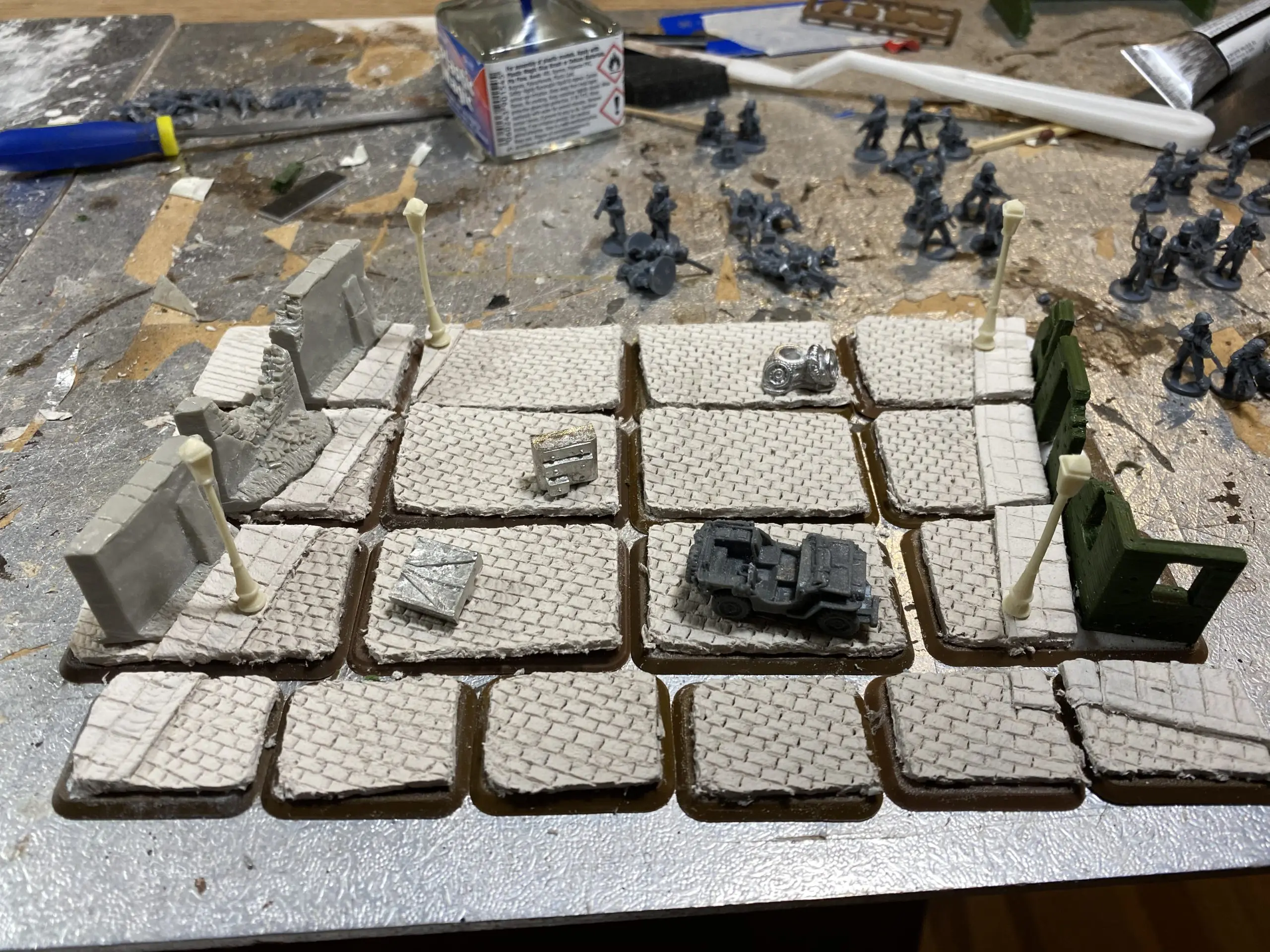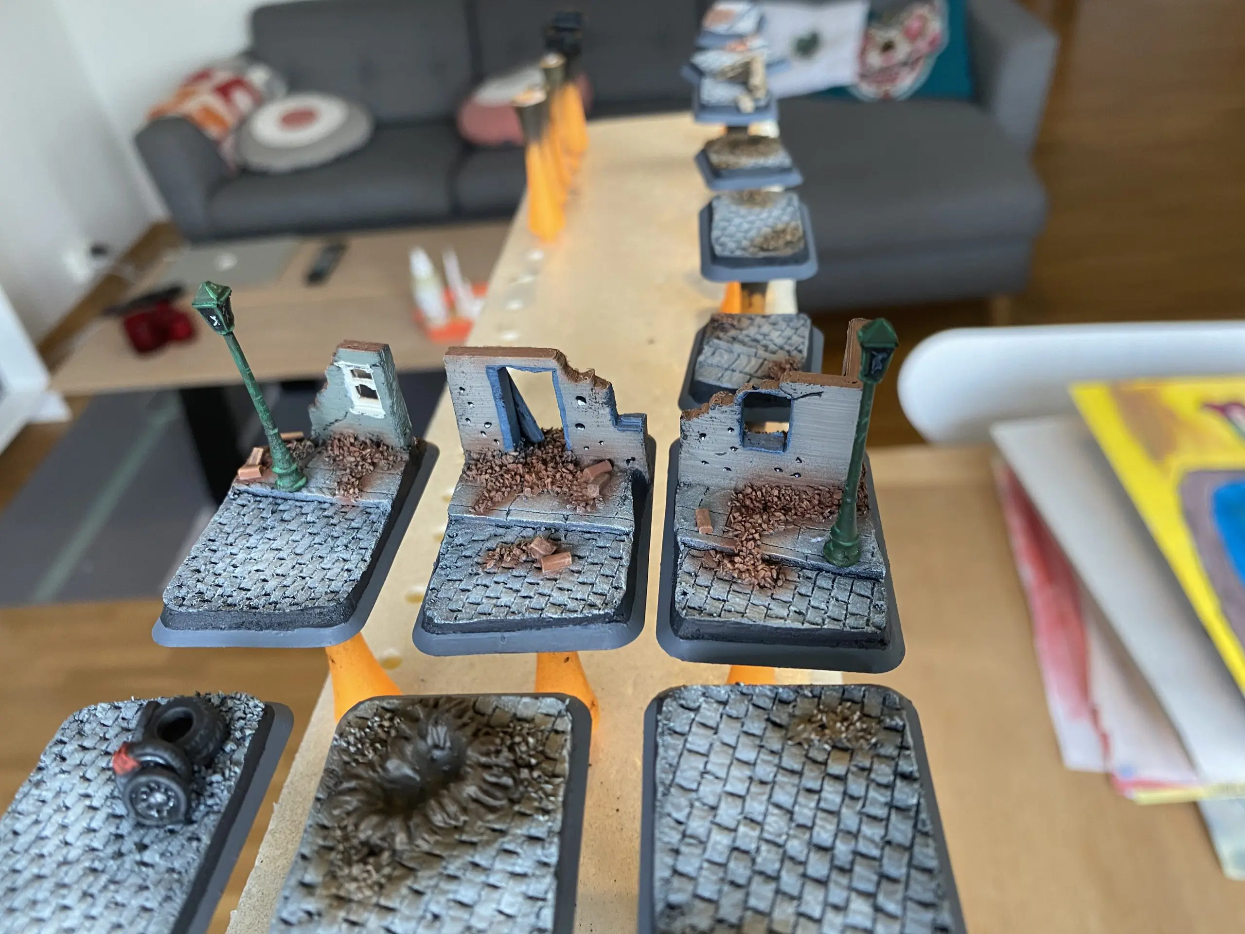 After the Clay had dried overnight I losende it from the tile with a knife and glued it to the bases with superglue and added some extra stuff to the middle 6 generic bases. Streetlight from Enrique, furniture from Peter Pig and Jeep from Battlefront.