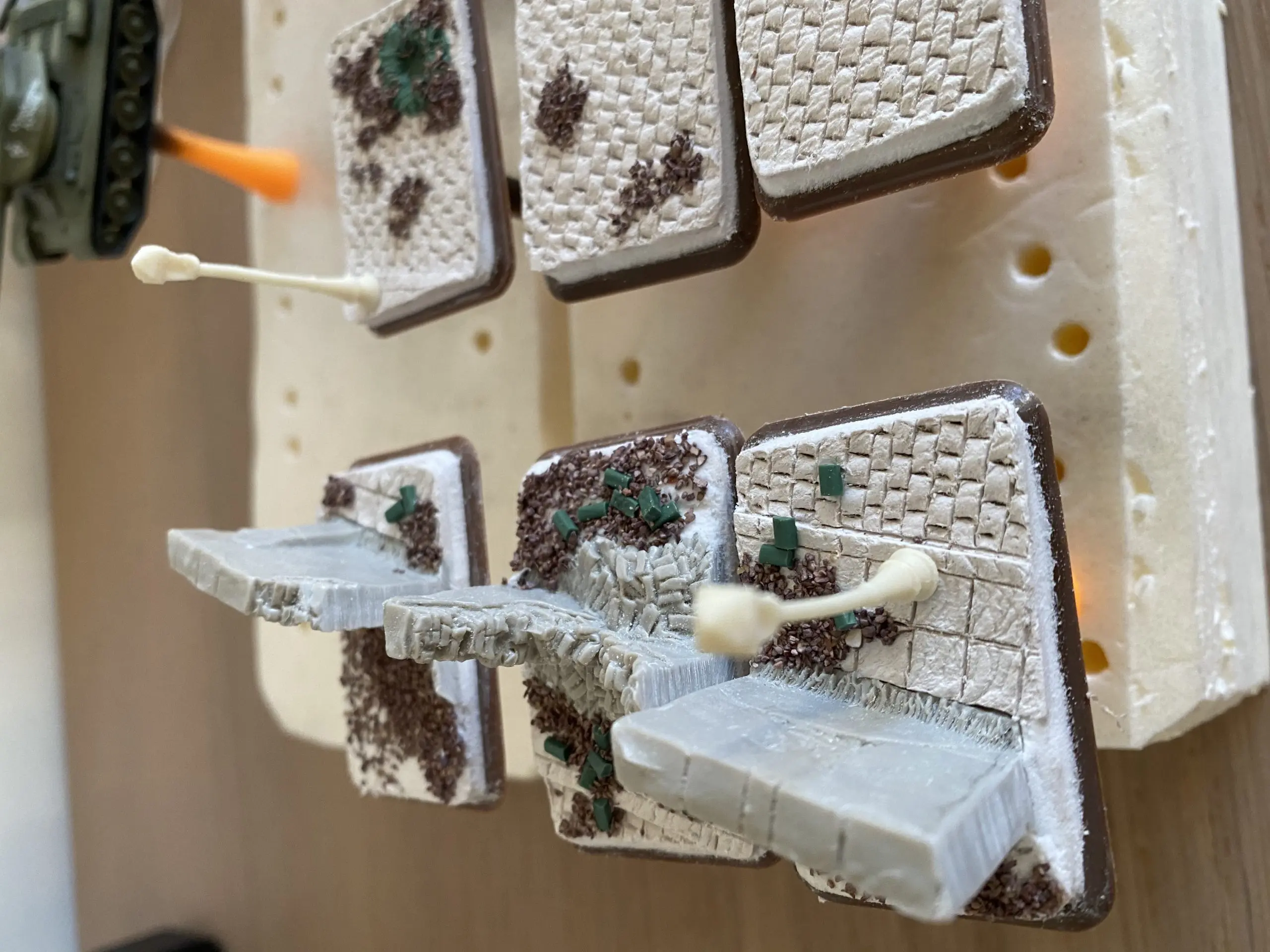To add some life and contrast to the bases some bomb craters and rubble was now added using fine basing material from The Army Painter and Green Stuff. As always when working with green stuff I mixed too much so I made some sandbags and also made a ton of bricks to scatter around the bases.