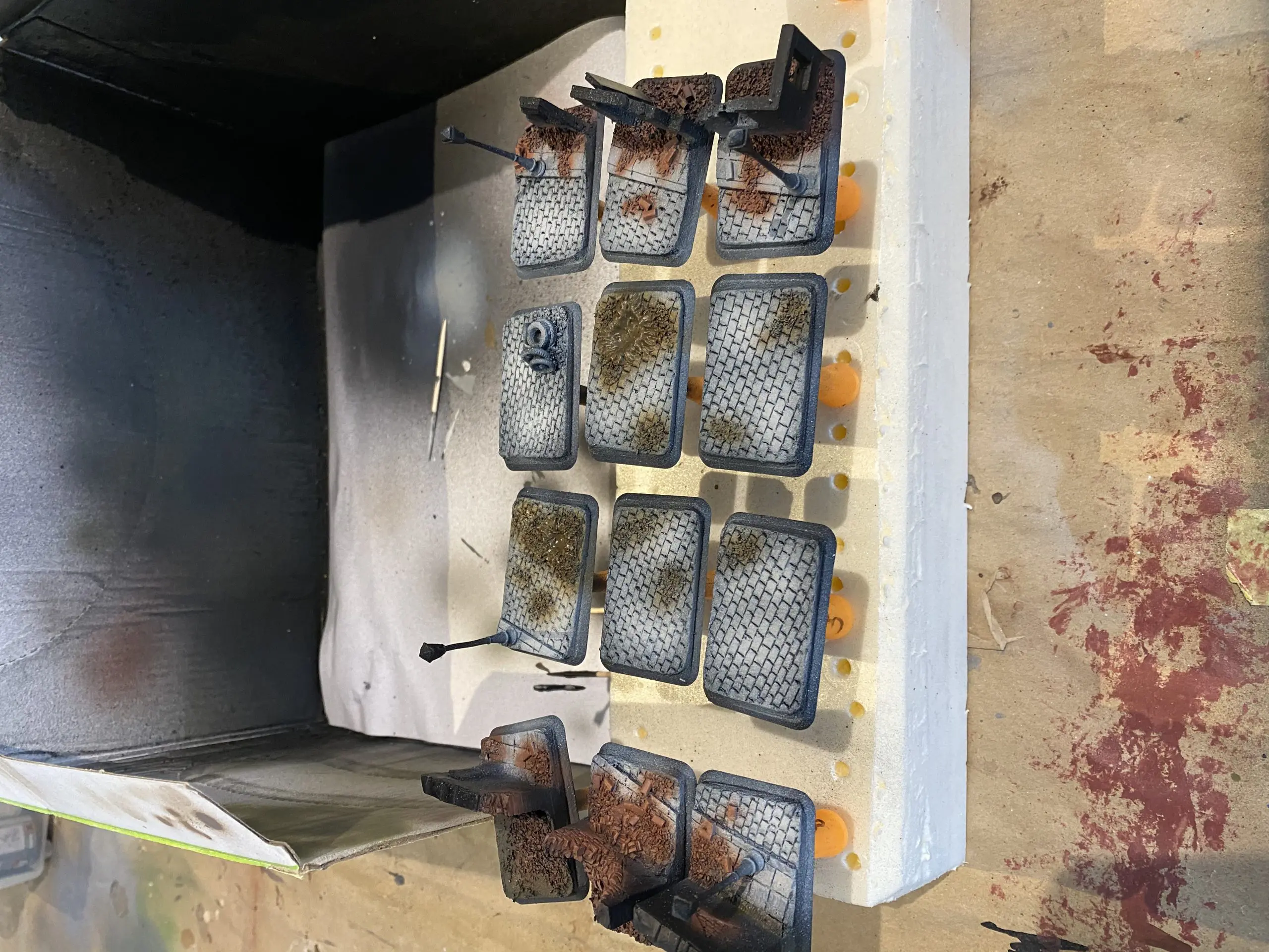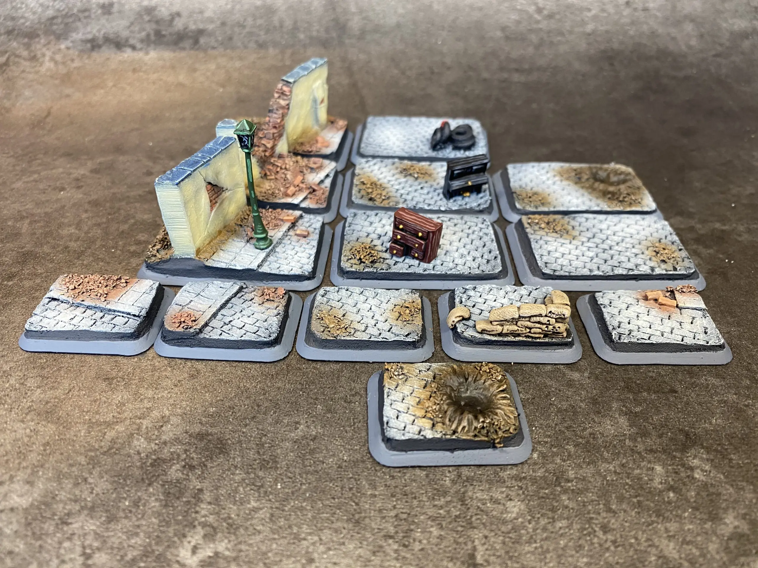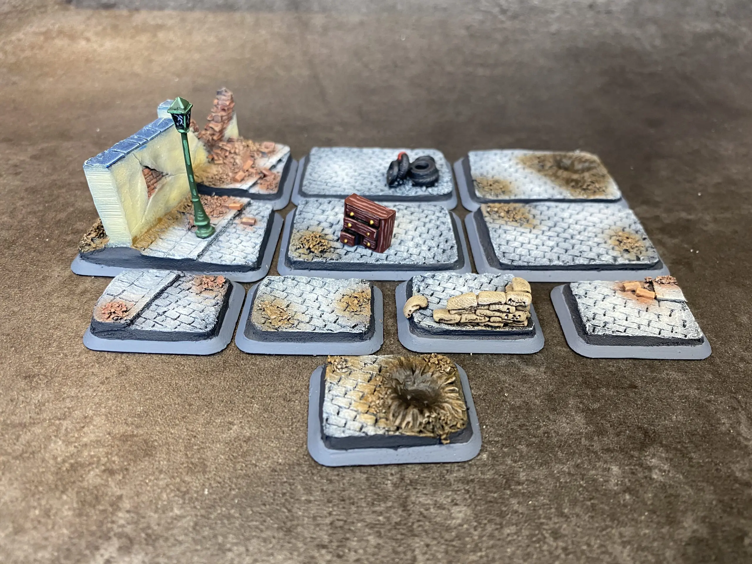 To tie it all together I finished with a very light drybrush of Buff and then it’s off to paint the infantry. After putting minis on the bases shell cases and pigments will be added to give even more life to the bases. Finally here is the 4 different configurations from the beginning.