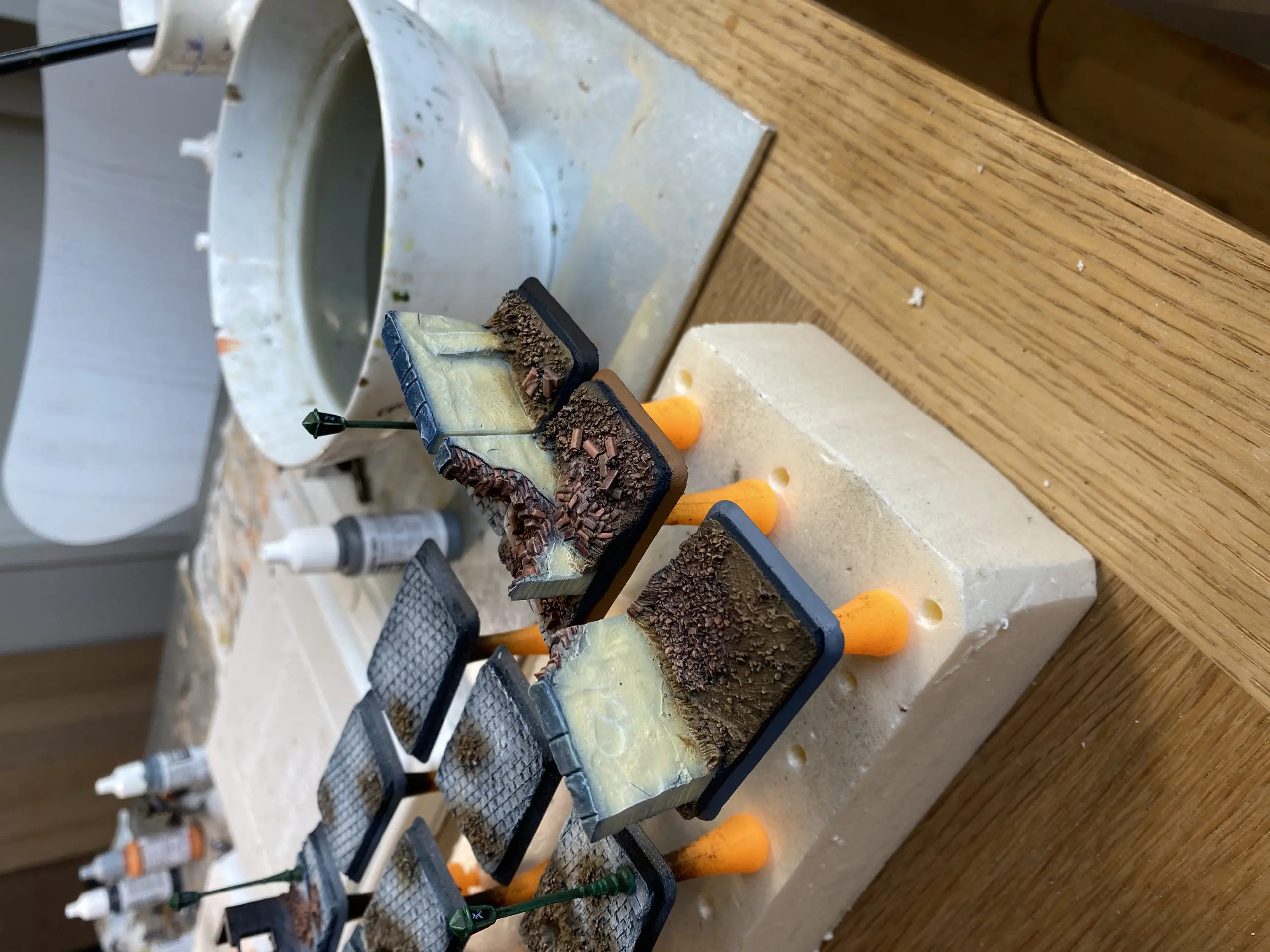The ground is Flat Brown, drybrushed with Beige Brown and Light Brown. Here you can also see the 3 different test colours on the base rim. London Grey, Beige Brown and Black.