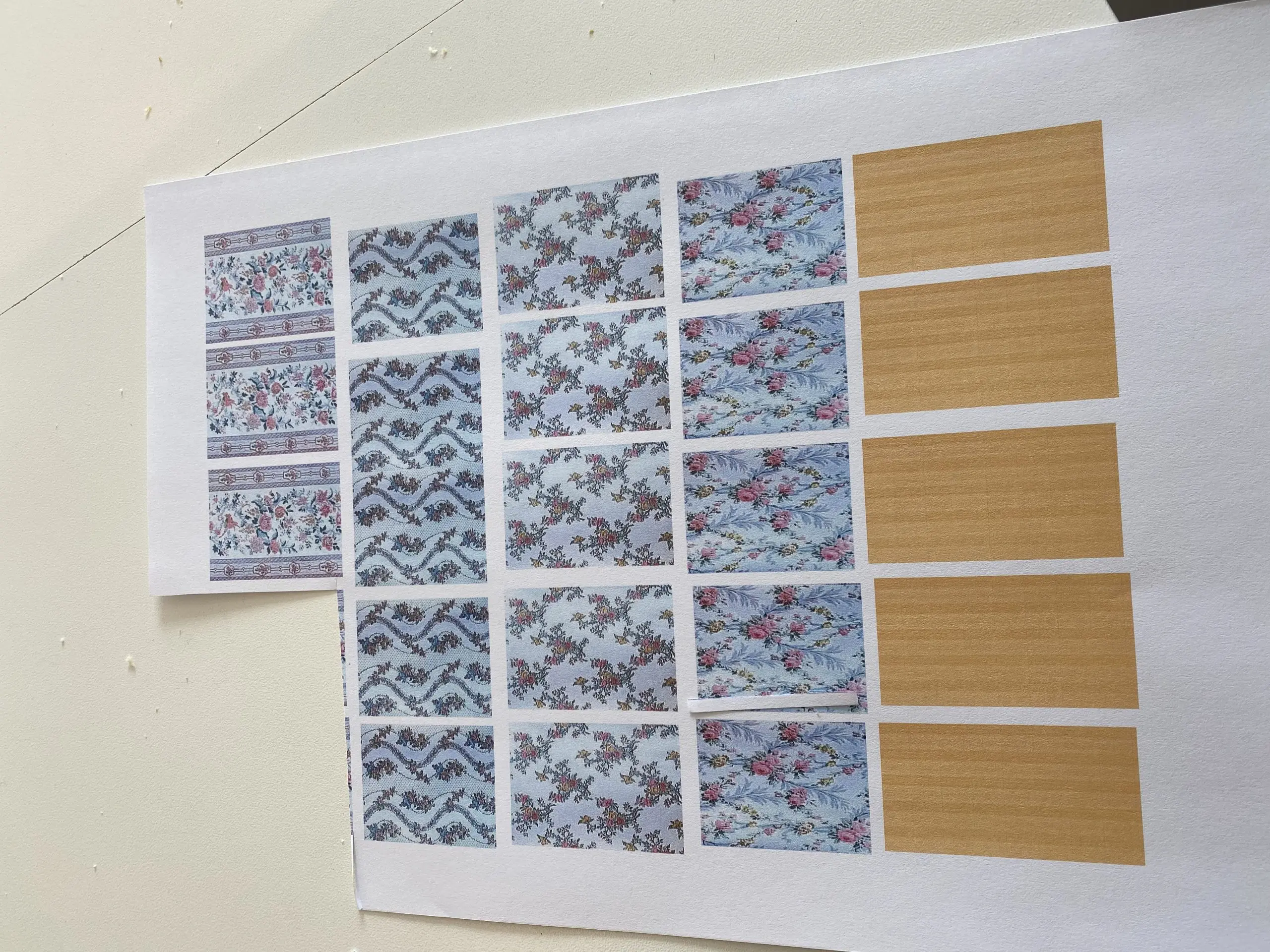 Now the fun begins. As the ruined house is 3D printed, it has printlines that don’t take dry brushing very well, so I decided to put wallpaper on the inside to add some life and colour. Now for anyone of you that want to try this at home, I can only recommend doing this before putting ground cover/rubble on the bases, cause it was hell to make it fit around the rubble. After applying the wallpaper I roughed it up in the edges to make it look more at home in a ruined building. Here is also a clear view of the door made from plastic sheet cut to size.