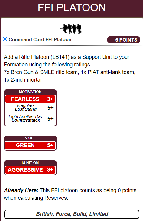This formation is based around the SAS who were parachuted into Normandy and met up with the French Resistance. While the French Resistance operated fairly independently under occupation, post-D-Day they were formed into the French Forces of the Interior (FFI) peaking at over 200,000 fighters. These forces assisted the allied efforts to liberate France, guiding forces, sabotaging and attacking key areas. In places they helped hold defensive lines, allowing other troops to be rotated or freed up for other actions.