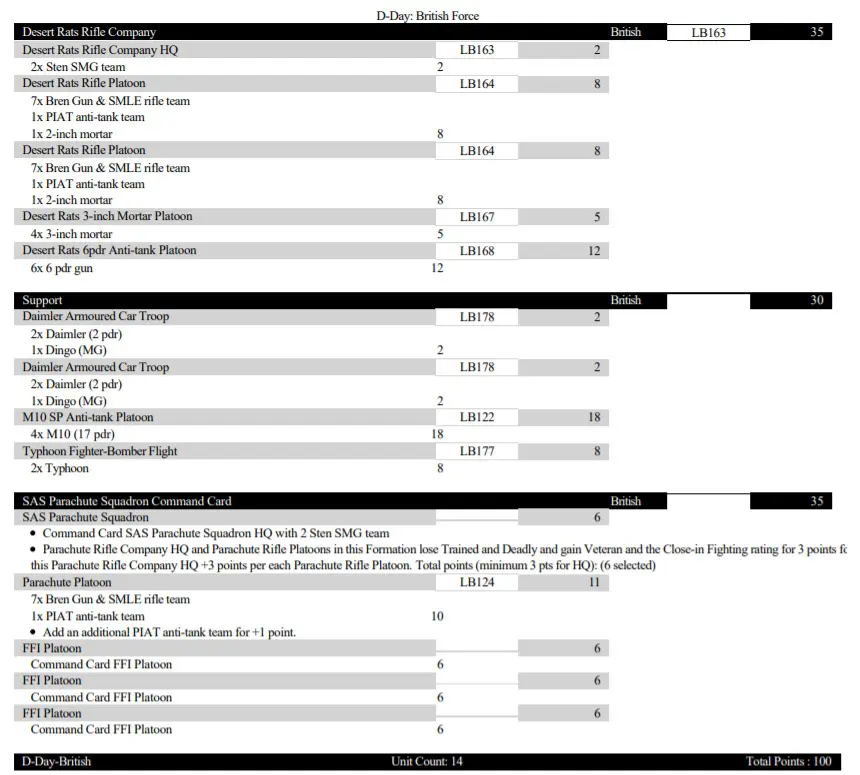 The SAS were and still are, the very elite of the British Forces. By modern standards, they are classed as Tier 1 operators and in WW2 they were groundbreaking, as they pioneered special forces tactics used across the world today. As such they have the best stats in the game; Fearless, Veteran and Careful. Just to add some spice in the assault they gain deadly for a 2+ assault. However, this comes as a pretty steep price of +3pts over a traditional Para platoon!