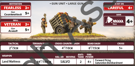 We also receive the Land Mattress rocket.  Mounting Navy anti-submarine rockets an a wheeled chassis and used to brutal effect by the Canadians, the land mattress counts as two guns when firing and provides a FP4+ salvo.