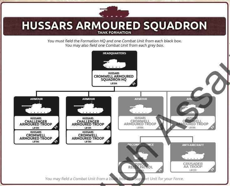 The upshot of this is that we get a formation that can have two Challenger platoons (of three to four Challengers) and two Cromwell platoons (also three to four tanks), both options being in the compulsory boxes.  Dingos and Crusader AA round out the formation.
