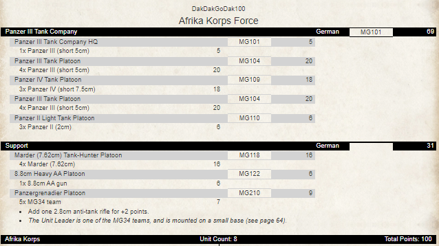 Unlike the other three nations, its hard to recommend adding a second Kasserine unless the US side is of use. The PaK-38 are redundant without building the force around a Afrikakorps rifle force which can use the second platoon. The extra PzIII are are useful but you really only need an extra three or four and maybe an extra PzIV. Still, let’s run the sums and see what we can get: