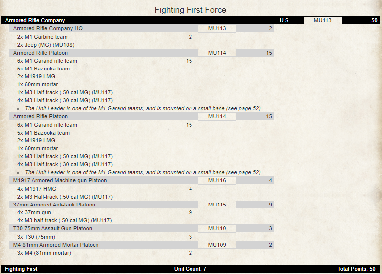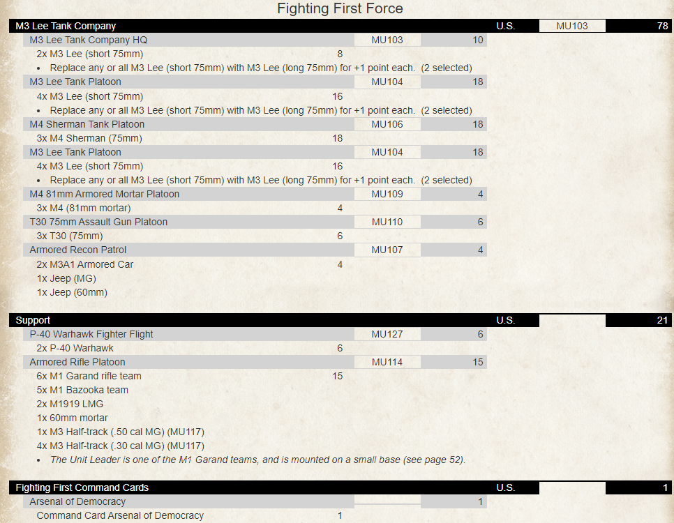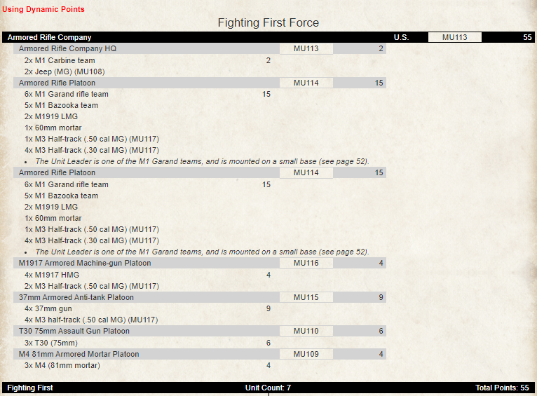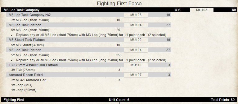 So back in 2022 I built and painted 172 points worth of units, options are quite good here as well. I could swap round my 81mm Armoured Mortars between the two Formations if only playing with one Formation in a list or Swap my Sherman and M3 Stuart platoons over between the Formation and Support components of a Force built around the M3 Lee Company. When I want to make something more competative I will use a cut down versions of both companies and not bother to add any Support Units as I have 4 artillery templates in the Formations already