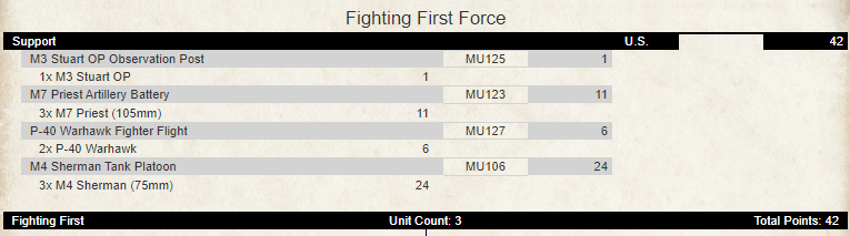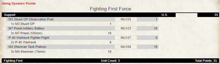 Tactically I will essentially be looking to compensate for my low skill in Assault by being able to blast my opponets units off the table and reduce their units near the objectives rapidly so I don’t need to rely on killing too much with an assault. I have the ability to deploy 2 smoke screens to cover my movement or reduce the effectiveness of long ranged German and Italian AT Guns and further reduce the effects of being Aggressive (hit on 3+). I will seek to get all my 60mm mortars ranged in on the same target effectively making them as useful as a regular 3 or 4 team battery, so I should have at least 2 bombardments firing for effect each turn.