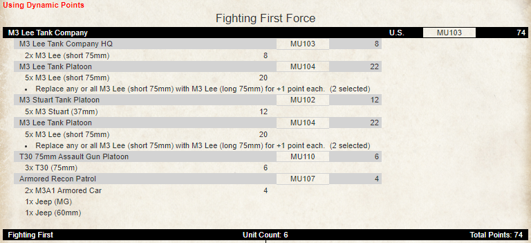 So the full ARP cost me 5 extra points overall, which is due to an uplift in the cost of the two artillery components of the Formation, not a significant change for such a cheap Formation and has little real impact. The M3 Lee Company now costs 6 points less overall with some of the benefits of the drop in points in the M3 Lee units off setting the uplift in all the other elements. Overall making this a more flexible single Formation choice than in 2022, erxactly what Battlefront were trying to do. My Support elements benefit massively from the change in the Sherman costing saving another 7 points, so now my Force in total comes to 164 points, just 8 less than in 2022 overall. Interestingly if I swap the Stuart for the Sherman Platoon under Dynamic Points this only increases the M3 Lee Formation cost to 80 points which is where I started back in 2022, yep its a couple of less tanks overall but 3 Shermans are a much more powerful unit in MW than 5 Reckless Stuarts (hit on 2+) I may have to add one more of these, which I could do by not upgrading the Lee’s to the long barrel gun. From this we can clearly see the overall impact of Battefronts aims in MW of making medium tanks a more attractive option whilst having a fairly neutral effect on the overall size of the Force. For the Americans in general better equipment doesn’t neccessarily translate into fewer models or more points being needed.