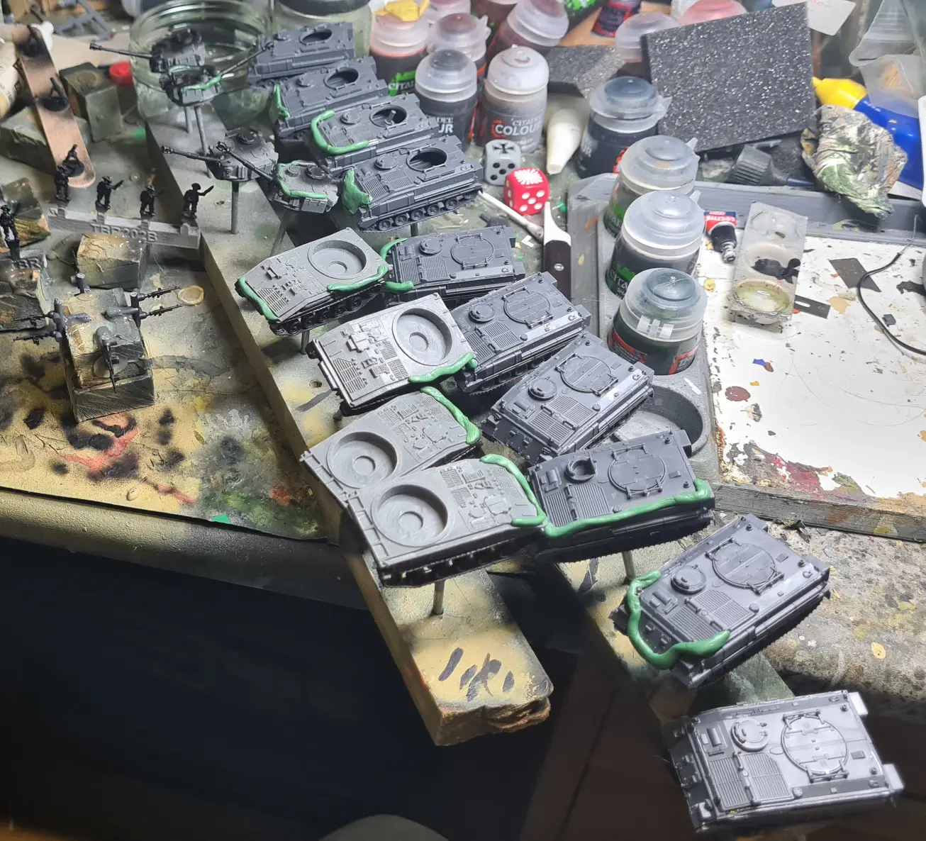 After priming in Vallejo Surface Primer Bronze Green and then base coating in VMC Russian Uniform, I dry brushed VMC Green Brown all over, as I had done previously.  Next came the AK Masking Putty (other brands with less idiotic marketing are available).  Previously I had masked all the vehicles in one go.  This generally took all evening which meant I had to spray the VMA Black Green the next night, by which time the masking putty had shifted and dripped.  This time, I did the vehicles in three batches (Abbots, Mortars and APC) masking and spraying each in turn, saving the putty from shifting.  This worked much better, even if it did effectively lengthen the process by an evening.