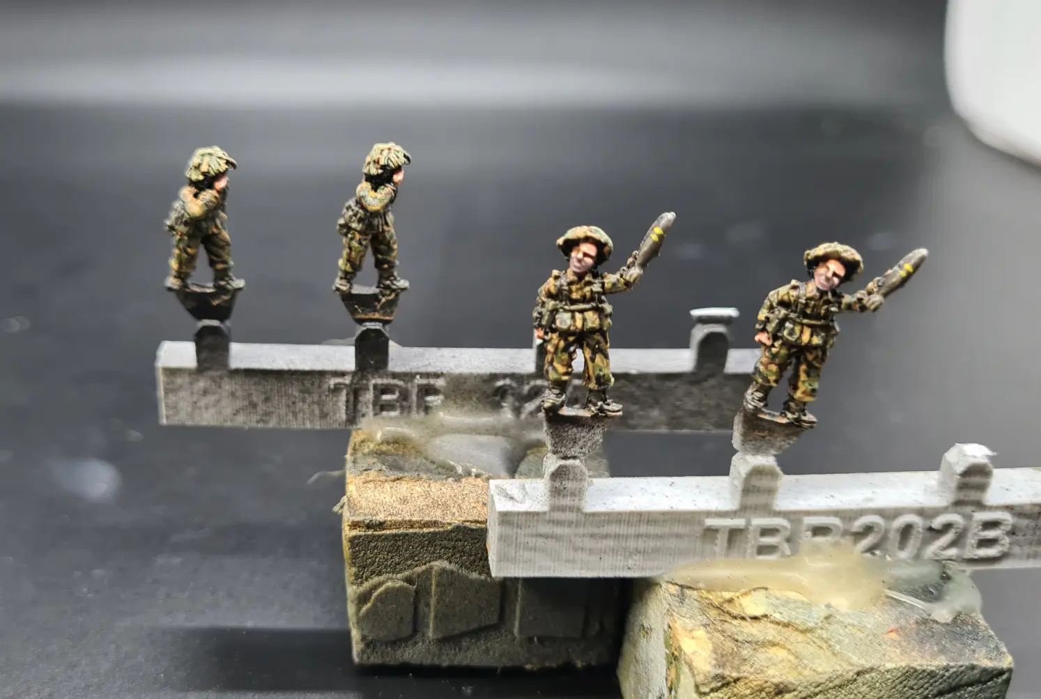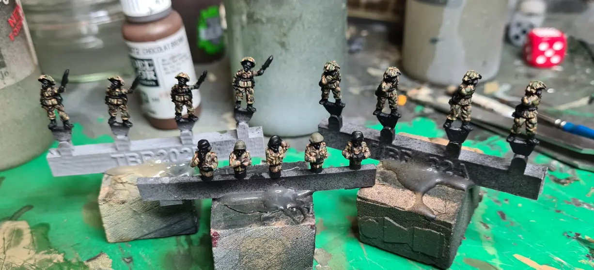 There isn’t much to go into detail with here as I largely followed my revised DPM method as covered back in part 7.  The only real modifications was that I remembered to add a light wash of Vallejo Model Colour (VMC) “Luftwaffe Uniform” to the lower part of the face for stubble. I also painted the beret on the FV432 commander black with VMC “Military Green” highlights to give the dark green look of the Green Jacket’s beret colours.