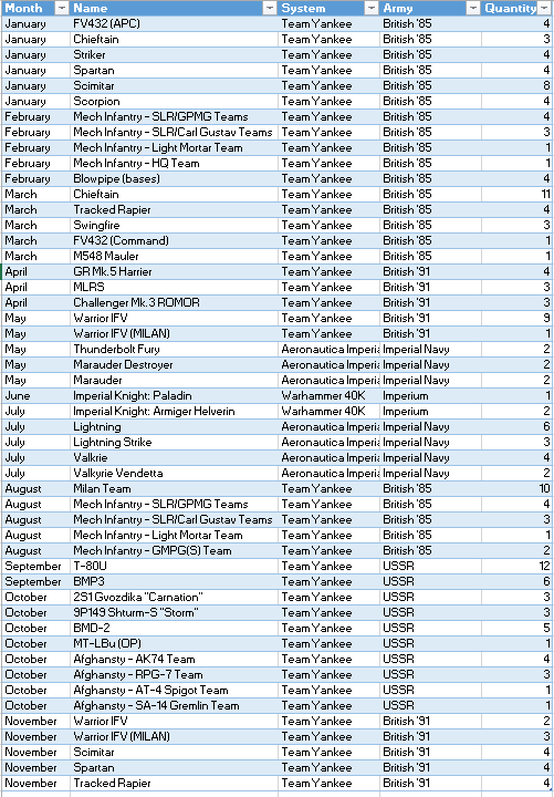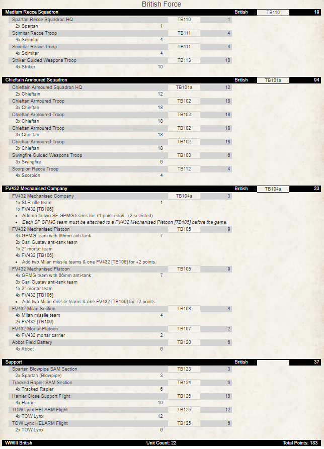 There’s not a lot to add at this point as that is a pretty solid selection of units.  M109 would be in the 1985 remit but somewhat redundant.  Warriors, MLRS and MCT are all a little out of the timeframe.  Challengers could be added but 3RTR didn’t get them to much later and I don’t think anyone in 4th Armoured Division had them at this point so it would involve some mixing of Divisions.  Honestly, once the Lynx are done, I’m calling this complete.