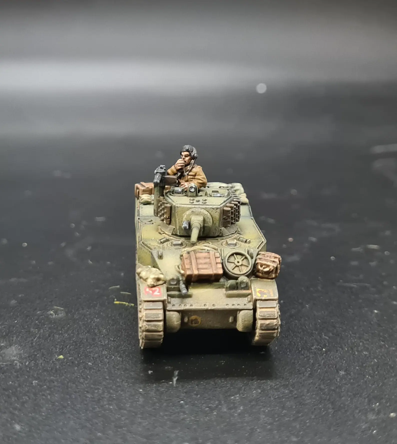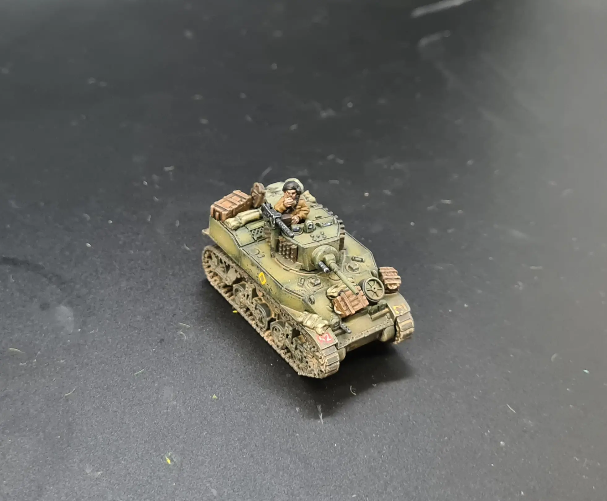 As with the last AFV, I hand painted the divsional badge, arm of service number and bridge number. The Stuarts and Crusaders were both from 3RTR so got a red “52”. The Divisional Anti-Tank units were number 77 on the Royal Artillery’s Red and Blue divided square whilst the Wasps are from the Monmouthshire’s Battalion Carrier platoon so got a number 62 on a green background.