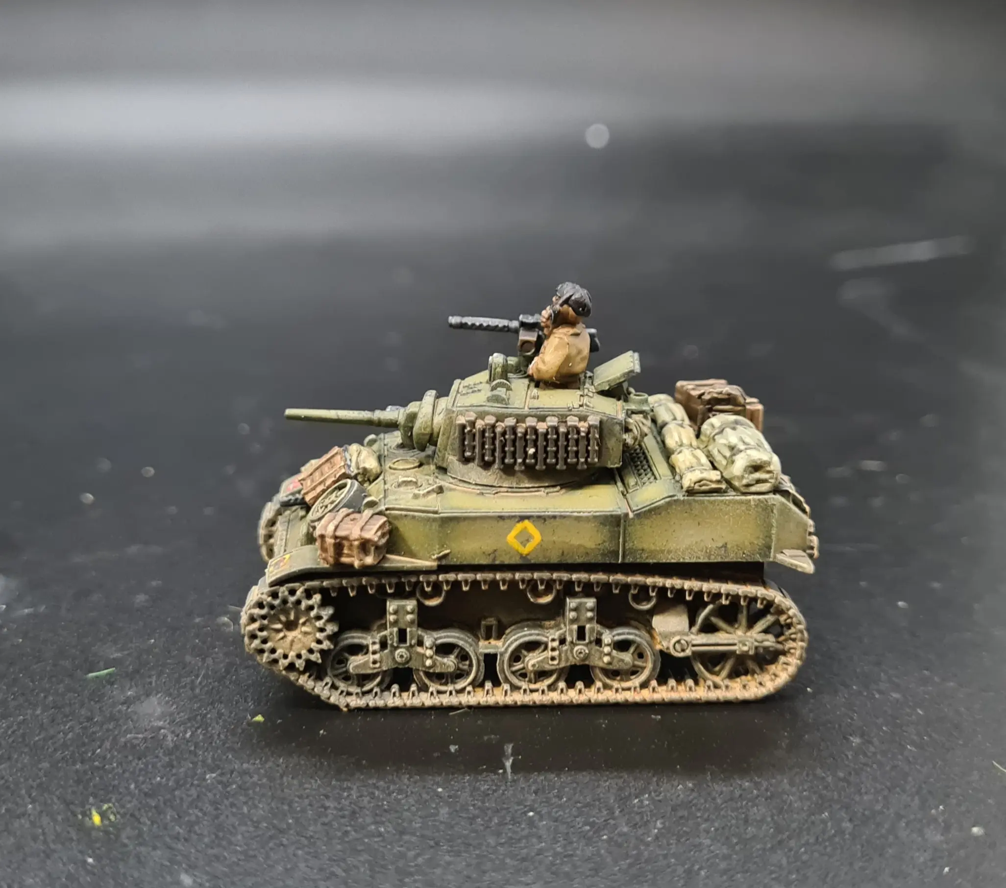 I tried something new with the 0.50 for the M10C. I sprayed the guns (still partly attached to the sprues) Vallejo Surface Primer Grey then, when dry, applied Citadel Contrast Black Templar all over. I then added a edge highlight with VMC Sky Grey. This gave, to my mind, a very effective looking “blued” finish to the M2 0.50s for very little effort. I then picked out the charging handles and spade grip in VMC Flat Brown and painted the ammo tin VMC Black Brown, layered on VMC Olive Drab (now called Olive Brown) and applied edge highlights of VMC English Uniform. I added some yellow lettering with Citadel Yriel Yellow and painted on an ammo belt in VMC Brass with a VMS Black Grey stripe down the middle for the disintegrating links.