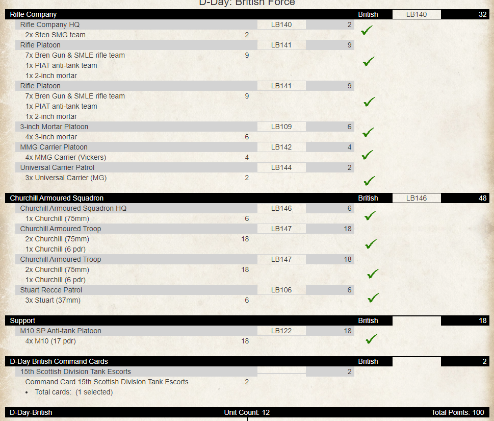 Whilst I was getting the Stuarts and Wasps painted, I met with Nathan for a game. I went with a two-formation force with Infantry (including Carriers, MMG carriers, 3″ mortars and a small MG platoon to use points) and a Churchill formation with some Crusader AA. A battery of M10C rounded the army out.