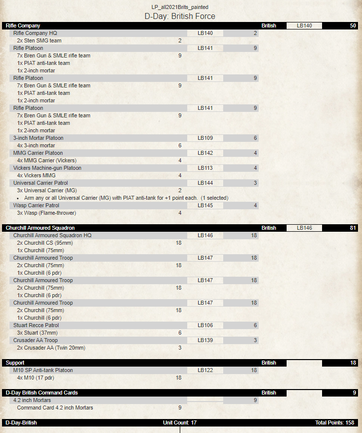 Given I started from a standing start (well, save the well established air landing force from v2 days!) its surprising how much I have got done since starting it with the Churchills in May! That’s 158 points in four months!