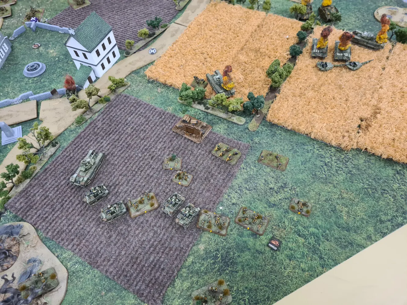 The right flank came under pressure straight away, with StuG and long range PaK-40 harassing the Churchills in the cornfield and bailing the 6pdr armed one on the first turn which then failed to remount until destroyed a few turns later.