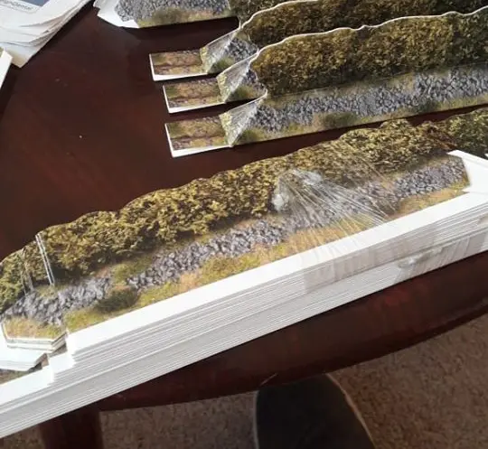 So lets start with the obvious;what’s in the pack. Aside from the advertising flyer, you get an eight page A4 pamphlet which includes all the terrain rules for the terrain typical of the bocage fields of Normandy, a five game linked campaign to play, plus the three “bocage” scenarios, “Brew-up”, “Bocage Country” and “The Meatgrinder” (these are all also found in the D-Day British book). Alongside this is over 27 feet (8m) of cardboard 3D boccage terrain pieces, which came in three bundles to stop them getting damaged in transit.