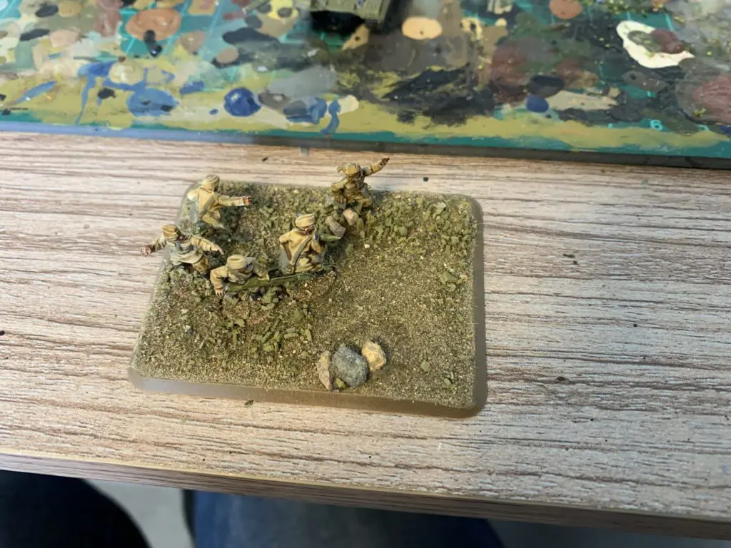 Next up I glue on the crew (not the gun). The base had been sprayed brown before hand. I give the base of the crew stands a quick brown layer, don’t worry about what brown you use, its purely to ensure that of the flock missed something you don’t see white.