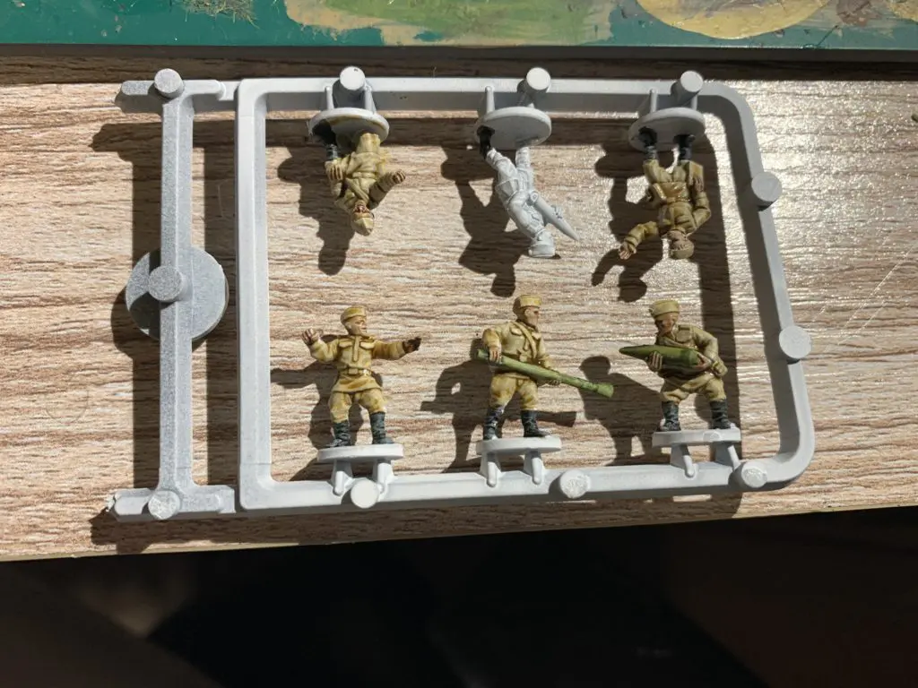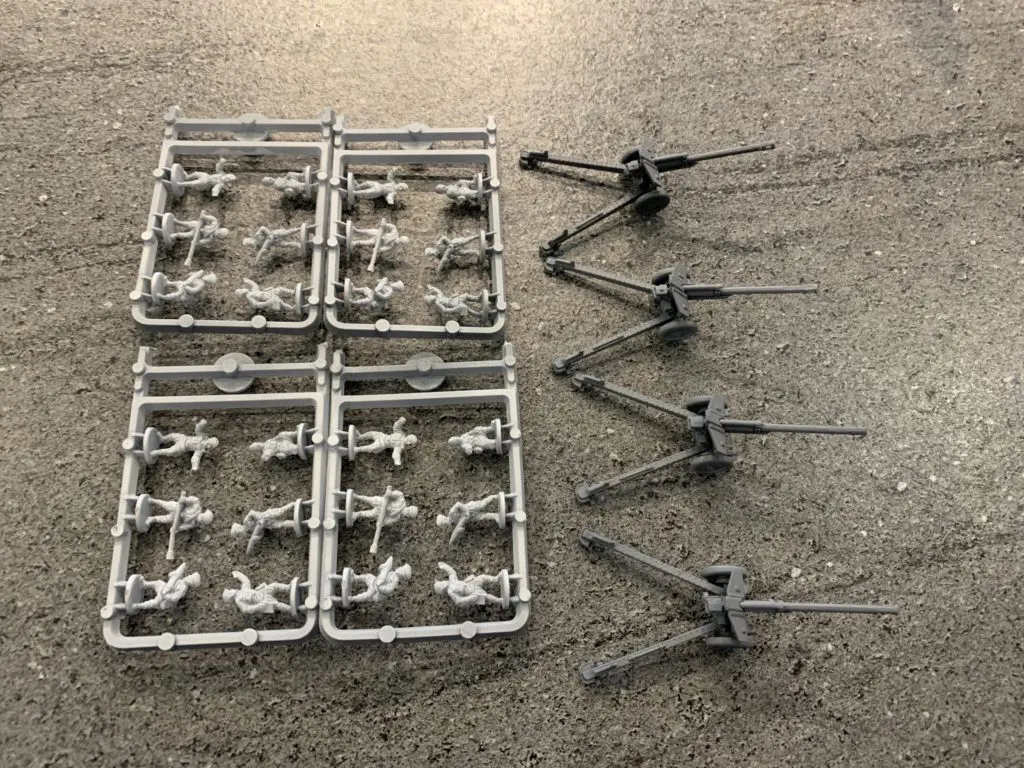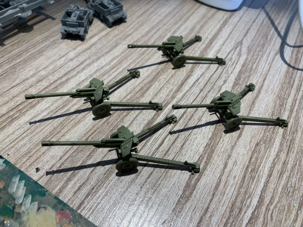 I started by assembling the guns as per the instruction on the box. As the box is for the 122mm guns but both come on the sprue I just replaced that part with the 152mm barrel. Guns were then sprayed grey and infantry white. For this I used a basic matt primer I get from Wilkinsons.