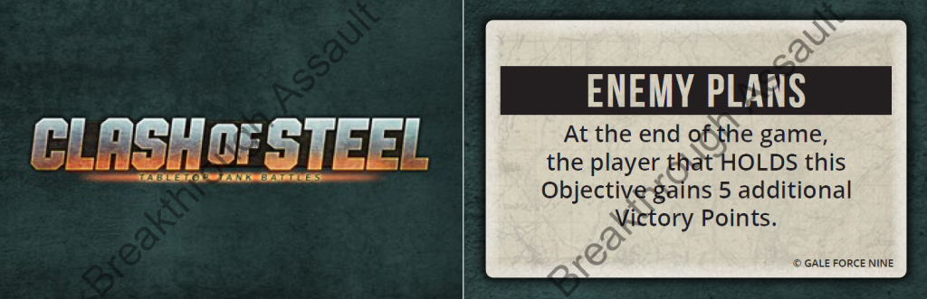 Next the actual objective effects are drawn randomly from another card deck and placed face down at on the objective markers. You only reveal what they do once they are activated, which happens as the game turns progress i.e in Turn 1 reveal Objective 1, in Turn 2 Objective 2 is revealed, etc.. These have random effects from making an objective active or inactive at a certain turn in the game or adding bonuses to die rolls for tanks when near the objective.