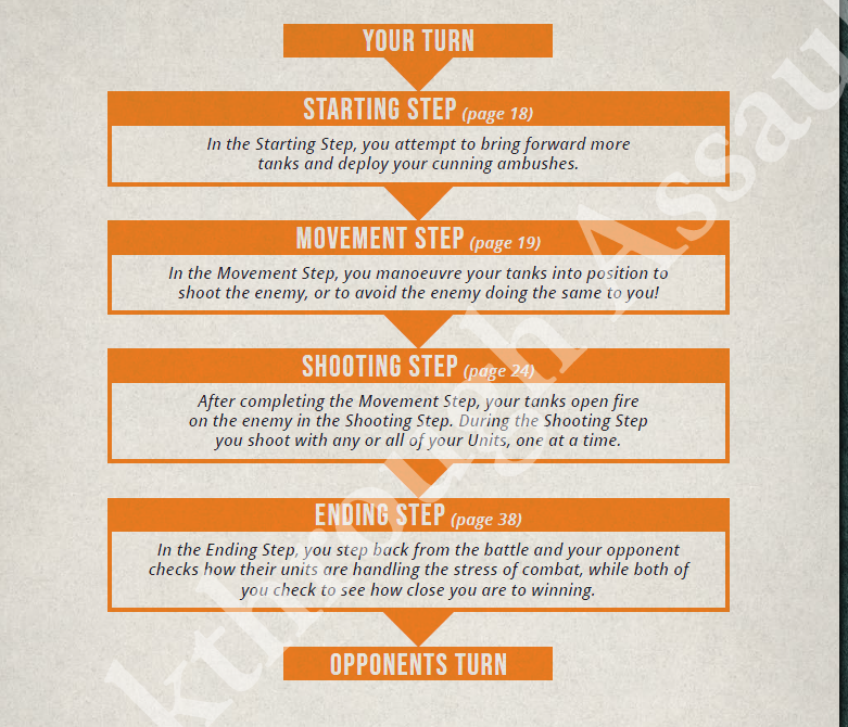 This will be completely familiar to existing players it uses all the regular mechanics of movement and direct fire shooting but as this is a tank vs tank game there is no bombardments or assault step (viewed by many as the most complex part of FoW). A key difference here between CoS and the other games is they have added in a new step the Ending Step, this is necessary to enable the scoring system used in CoS where players both score Victory Points VP’s) in each player turn for objectives they hold and for platoons that they destroy that turn. The other games only score victory points at the end of the game due to their game ending mechanics. This eliminates the rather unsatisfactory mutual loss outcome in CoS games but does introduce a true drawn game result if both players manage to score the same number of Victory Points (not likely but possible).