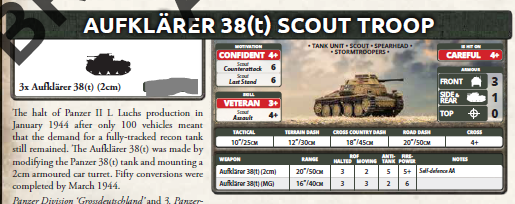 One noticeably revamped Unit, the StuH is the new bane of Recce. Impervious to the Recce from the front, with top 1, and a gun that can raze the tiny Scouts (and any other light armour with top 0) from the surface of the board, those bad boys will shift radically the concept of Recce being the Apex-Predator of LW V4 in competition. Available to all German lists (it’s a Black Box Unit and a Black Box Formation), with a price in line with the Wespe, it allows German to align 2+ Units of AT3/FP3+ templates, on top of a complement for Berlin Germans to play the Rule of 4 with Artillery. There will be a before and an after, and I’m glad this Unit makes its way into the meta to shift it heavily.