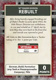 Now, if you want to make it a little bit more cunning, the first thing I would add is the Command Card Deck for German D-Day. Those Cards will give you a couple extra tricks you can use. For this Force, I’ve picked the 16th Panzer Division – Rebuild, which downgrades Tactics to 4+ (bad for Stormtrooping Germans) with a -1 point discount per Unit of the Formation (saving key points in the process), and the mighty Lucky to re-roll a critical die.