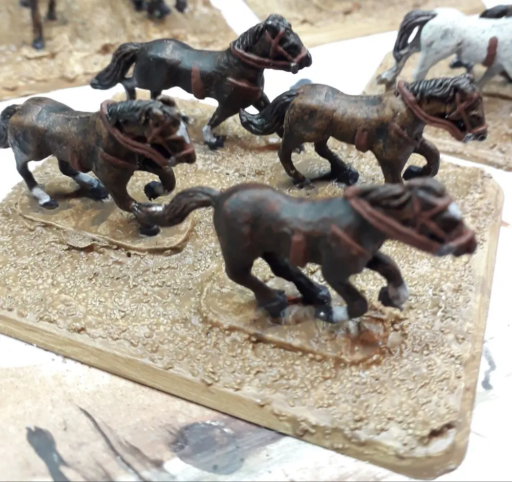 Let me explain more. I decided after doing a bit of the research the majority of my horses would be bays – a bog standard mid brown colour, the remainder will be an other colour for visual variety. In my case either blacks, greys or chestnuts, I didn’t find any evidence to support pie bald or palamino colouration. To reflect this I choose to paint 50% of my horses as my primary bay colour and 50% another colour (i.e handy as there are 4 on most bases). My basic brown for the bay colour was two coats of GW Contrast Garghak’s Sewer. My chestnut mix was achieved with 1 coat of Gore-grunta Fur over painted with the Garaghak’s Sewer (or the reverse combination, the out come is different) and the darker brown by over painting the base brown with Basilicanum Grey – I also painted the manes and tails this way for some basic horses to make them darker. The near black horses are either two coats of Basilicanum Grey for a near black or Basilicanum Grey over Garaghak’s Sewer for a very dark black-brown. For the light greys I used two coats of Apothecary White and for the darker grey its was Basilicum Black over Apothecary White. Sounds a lot but it’s just 4 colours giving me 8 variations.