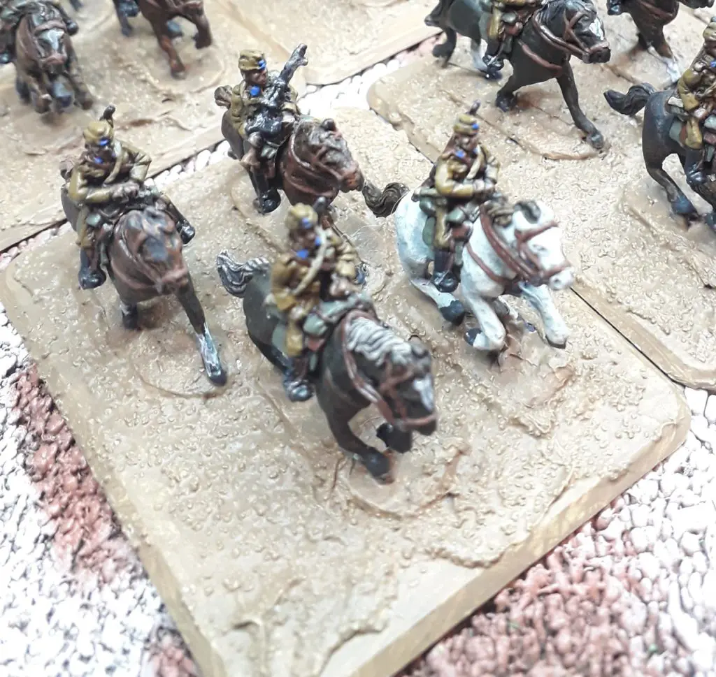My rider figures are painted following the guide in Colours of War. I used a mix of based before painting (the Rifles and Horses) and painted before basing approaches (riders, guns). I often mix and match this depending on the detail on the model I am going to be painting and how much access I need to the whole figure.