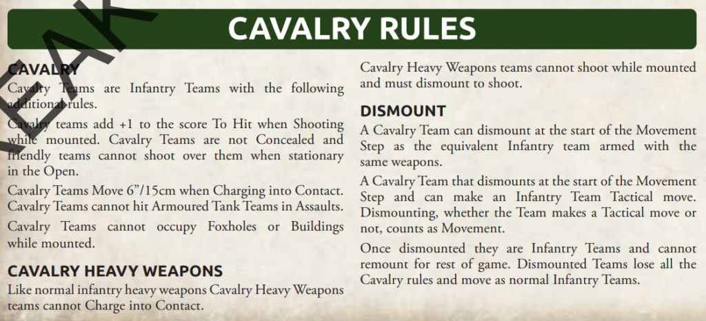 This will influence how I build out my Formation for playing in the MW period as I want to be the Attacker as often as possible so I will be choosing support units designed to attack to go with them. The other major challenge with cavalry troops is they can’t Assault Armoured Tank Teams whilst mounted so you need to provide them with either lots of AT support or understand how to manouver so you can Dismount safely if you need to assault Armoured Tank Teams, don’t forget they can still Assault you! On the plus side against infantry and guns you move 6″ when charging into contact not the regular 4″ this can enable your supporting artillery to keep firing at the defenders even on turns you plan to Assault as danger close is less of a problem.