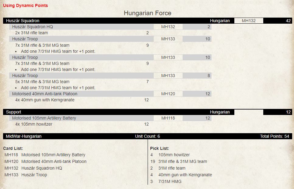 The MW Huszar Squadron Formation its a pretty basic one with an HQ, 3 Huszar Squadrons, a 40mm AT platoon and a 75mm Mountain Howitzer Battery. Looking at the LW Rifle Formation the 75mm guns aren’t an option so I decided to leave these out of my shopping for now (Battlefront dont make them either!). I will start with a Support platoon of 105mm Artillery instead to provide some artillery. I will need some heavier artillery guns anyway and these are available in both periods (even if they aren’t particularly favourably pointed in LW). To complement the cavalry I will need a couple of platoons of infantry for dismounting as well. Each Huszar platoon can have an attached HMG Team in MW these can be re-assigned to form an HMG platoon as well which is handy. So my initial shopping list consisted of these units but, how many did I need?