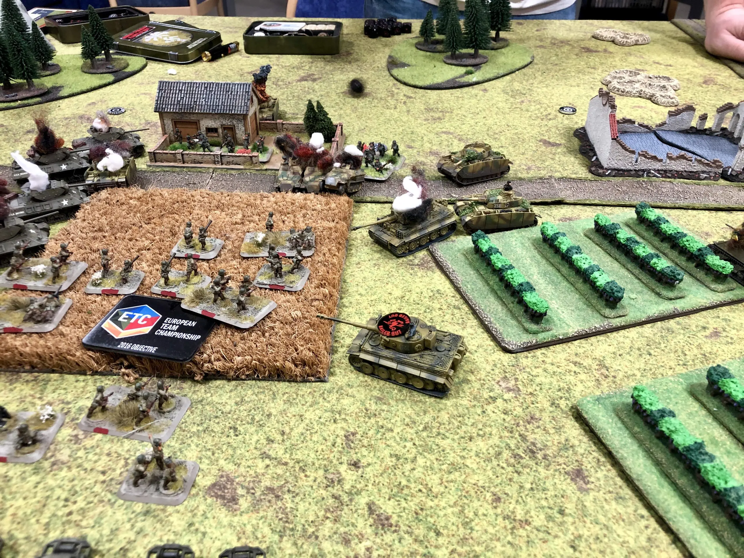 The recce reported 2 x Tigers and 3 x Stugs advancing on the Church and a platoon of Panzer IVs behind the rocky rise to his front. On the other flank some form of PanzerIII was forming up along with Grenadier support and their Company Command.