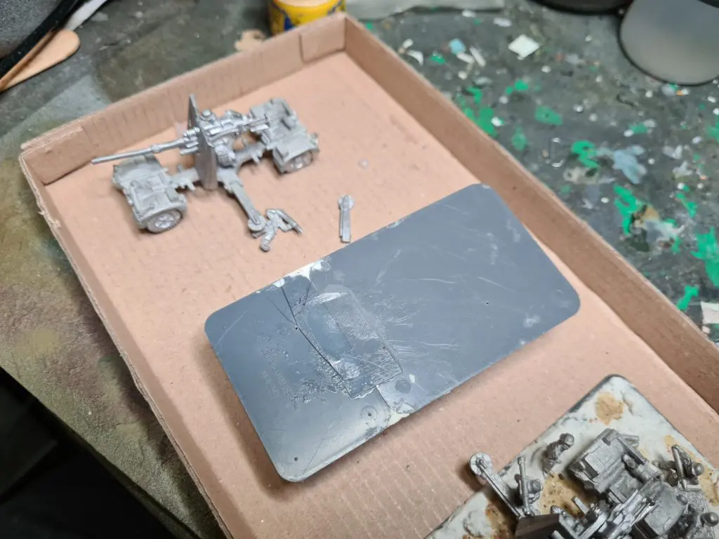 Split its three parts for painting.  The carriages were glued to the bases but the gun mount was left as a separate assembly to allow turning and packing in a standard case!