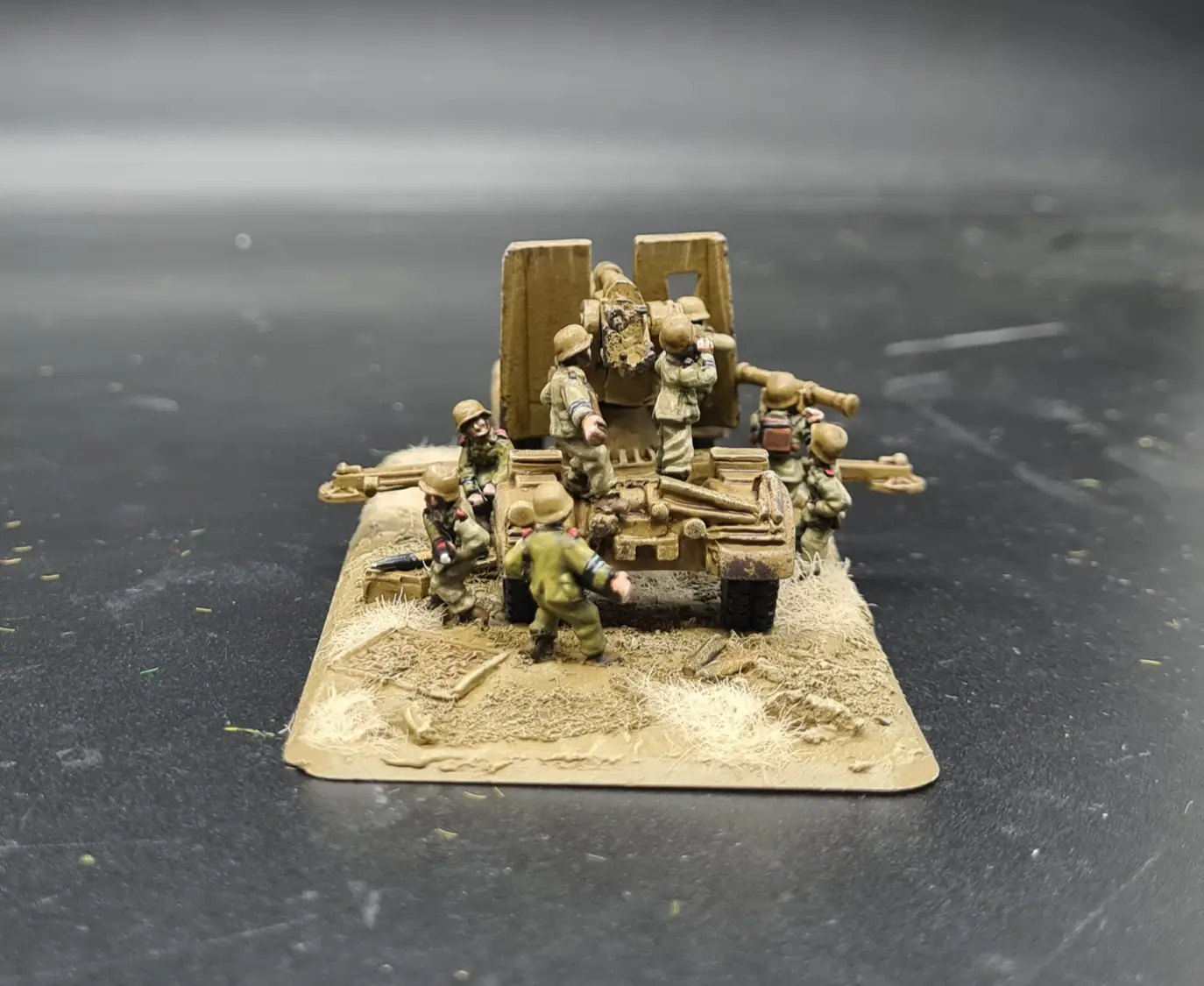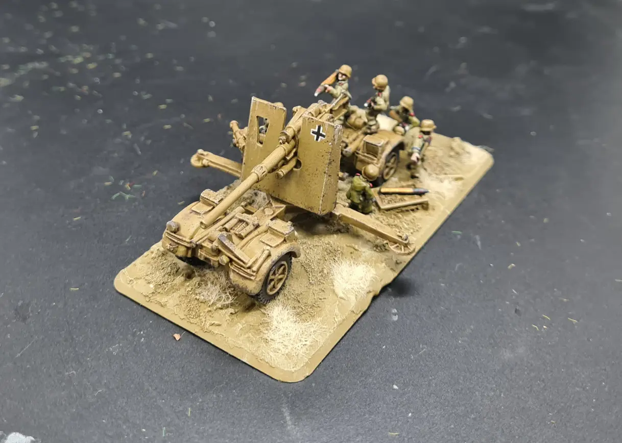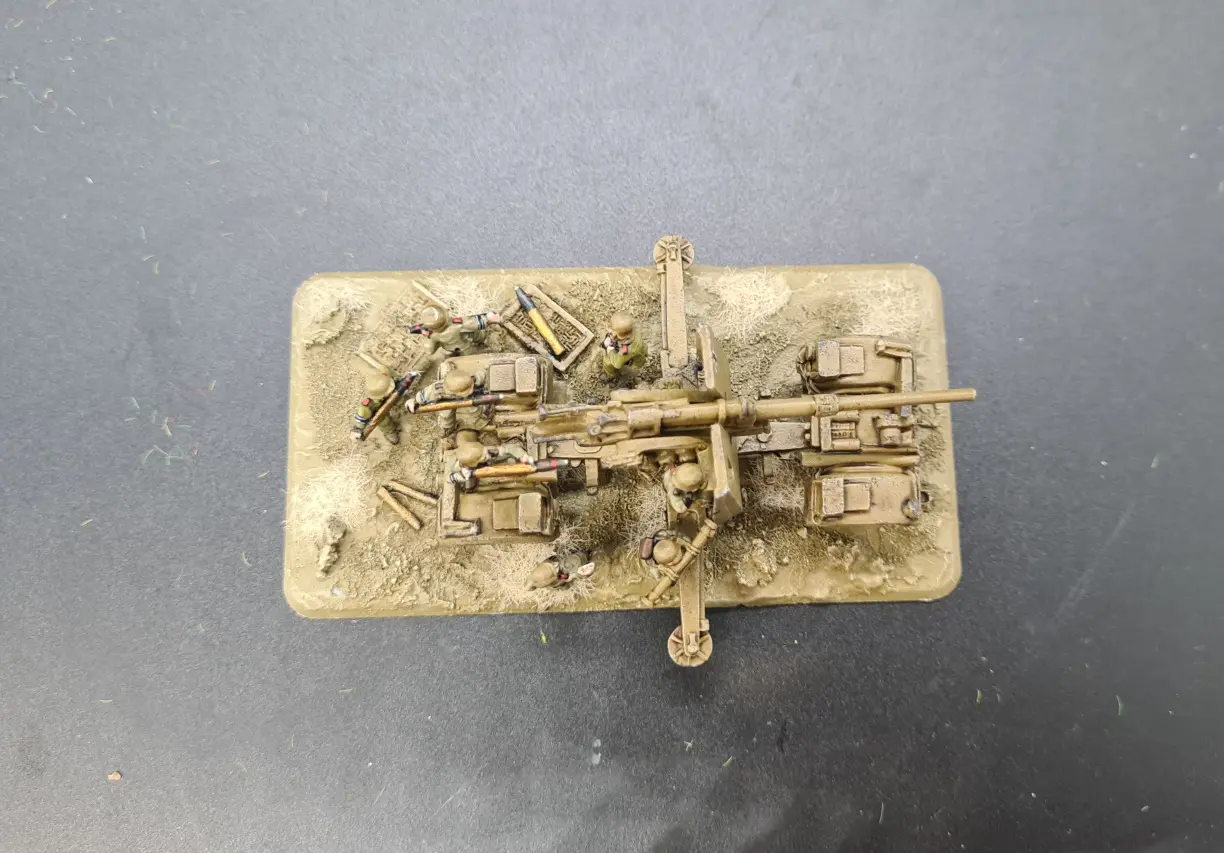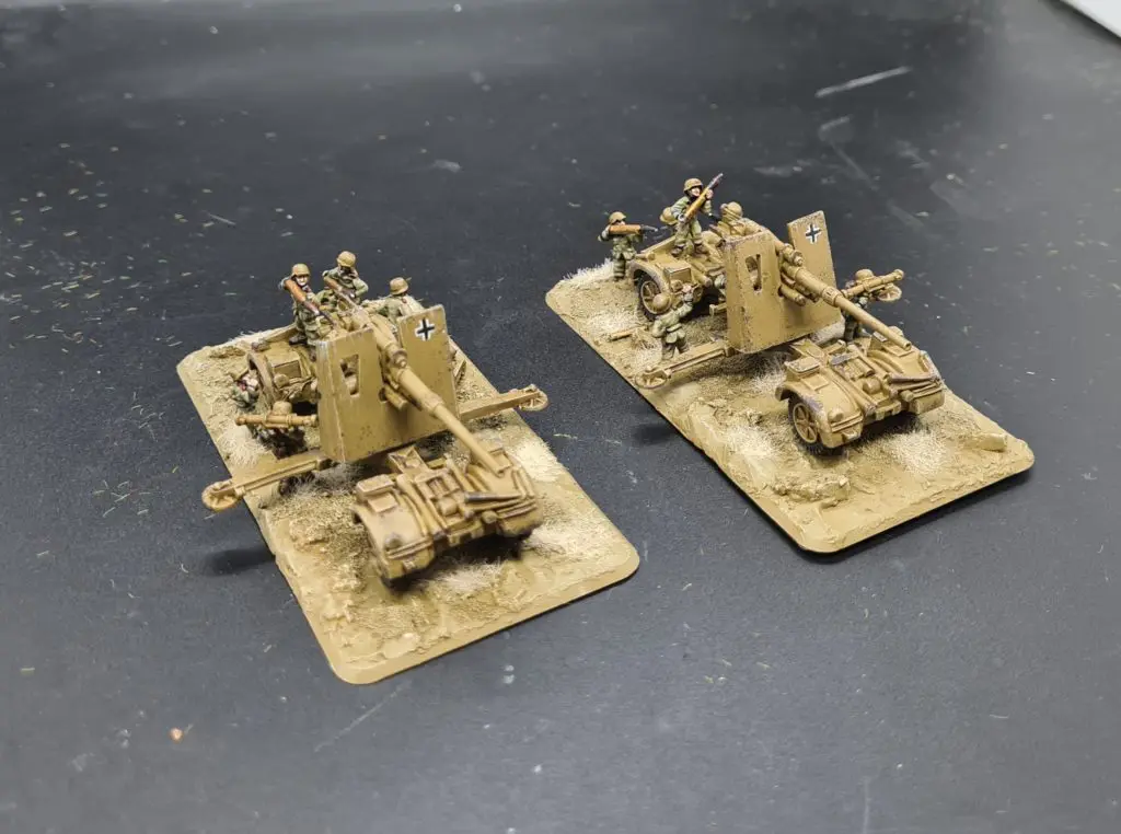 Lookin’ AWESOME! Regarding your extra-large bases for the 88s – back in my v3 days I turned the “workshop” kit (the one with the mechanic working on a panther engine) into an arty HQ. It turned out really great, with a big ole antenna on the truck and radio equipment on the workbench, but my point is: an arty HQ was normally on a medium base while the kit was modeled on a large base. NOT wanting to give my opponents more base to target I notched the sides of the large base to delineate x2 medium bases and then did a slightly different basing treatment on one half – enough to easily distinguish the two sides visually at table distance but not so much that it looked weird. I then designated one half of the mini-diorama as the “active” part of the model – the actual, in-play arty HQ – and the other half as “inactive.” I helped my opponents out by concentrating the HQ figures on the active side. I never had anyone complain but I also only played friendly games, not tournaments…